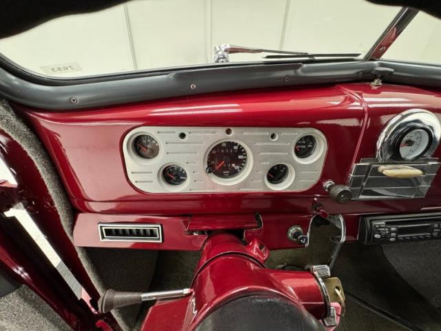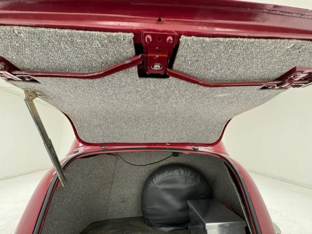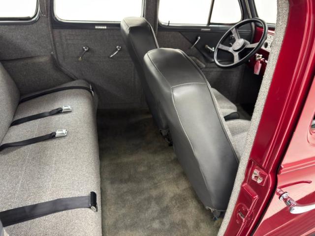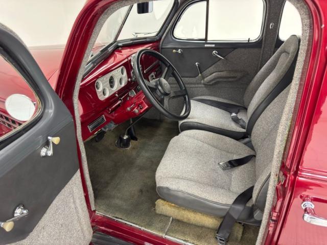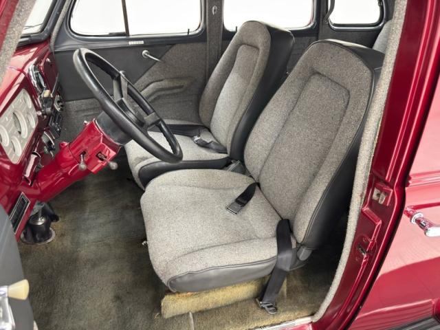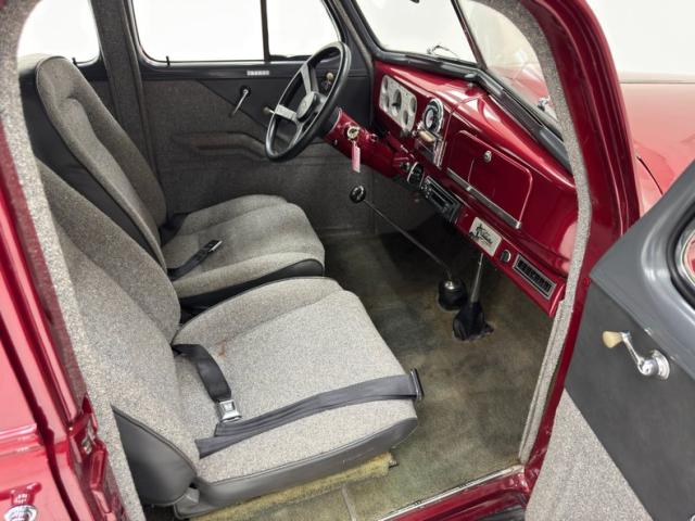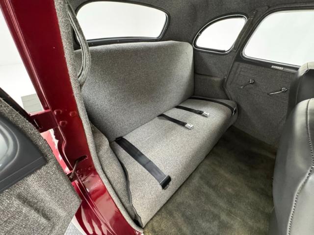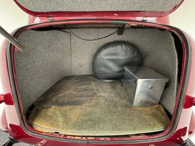 Handsome gray door panels include tweed lowers, vinyl uppers, and a gray painted window frame and all four present cleanly. Tweed continues on the front bucket seats and the rear bench and sidewalls. A familiar Chevy steering wheel from the 80\'s presents to the driver in front of a body colored dash and billet style faceplate housing a series of clean black faced gauges. 1938 makes an appearance in the center with a deco style surround for the added white faced tachometer and we return to modern times with an AM/FM/CD radio next to levers for the fans. A tall shifter and handbrake rise from the open floor covered in gray carpet and surrounded by tweed walls in the footwells. The headliner and visor keep the theme and are in fine condition. It also covers the trunk walls over a deep pile gray carpet topped by a battery box.