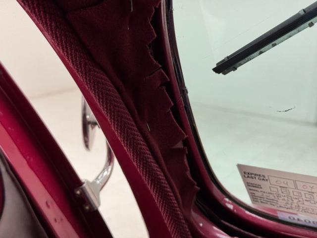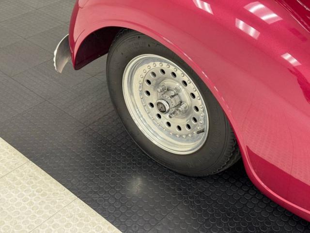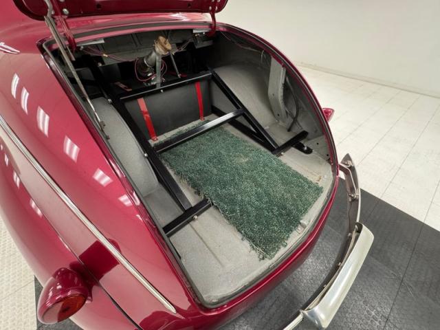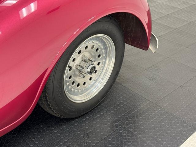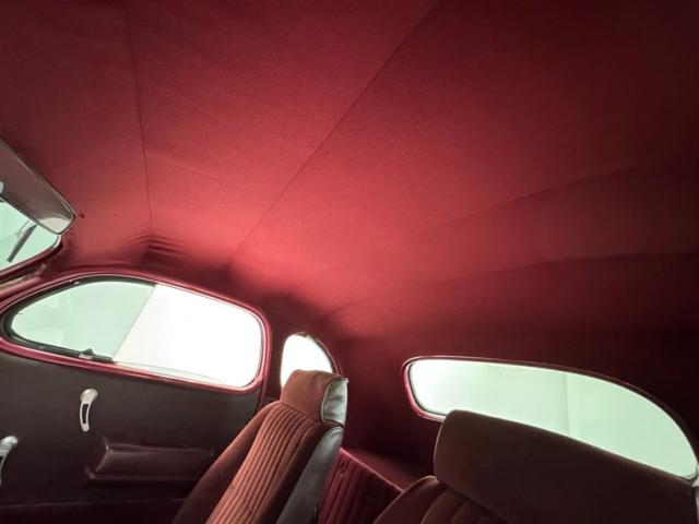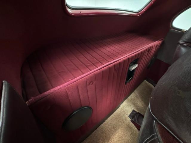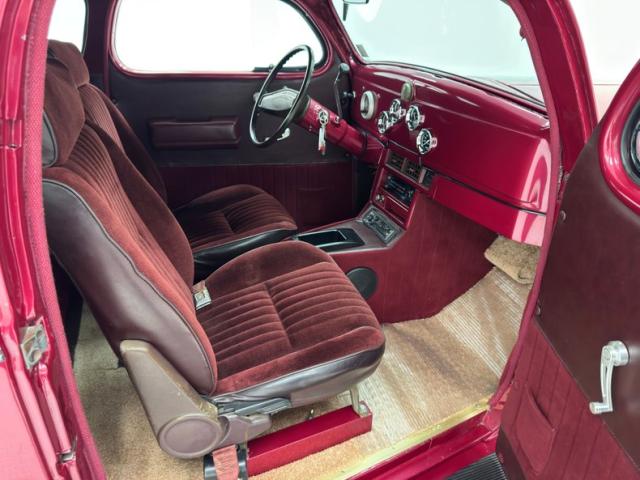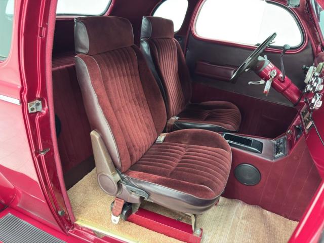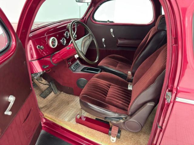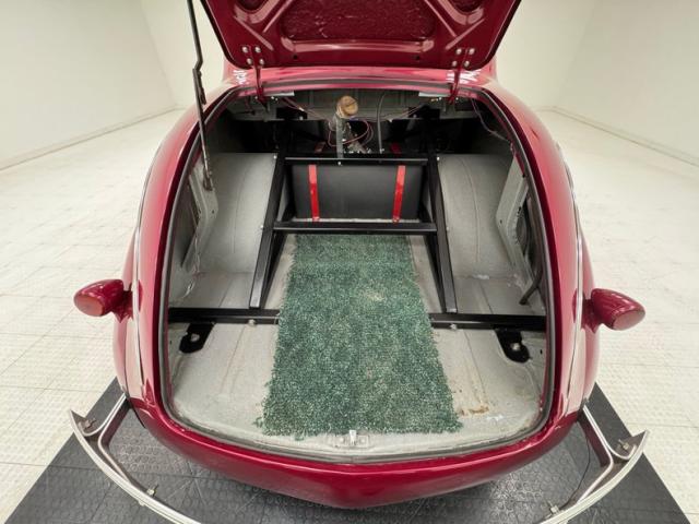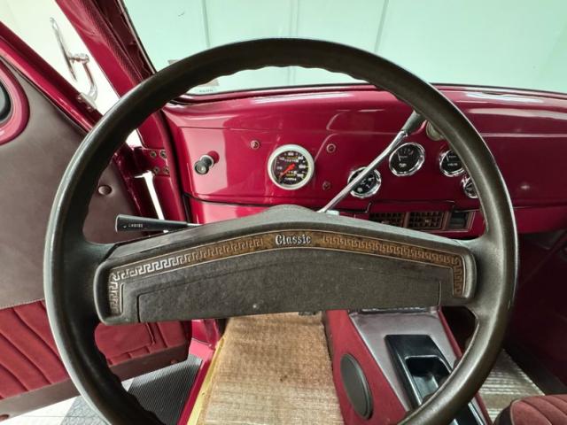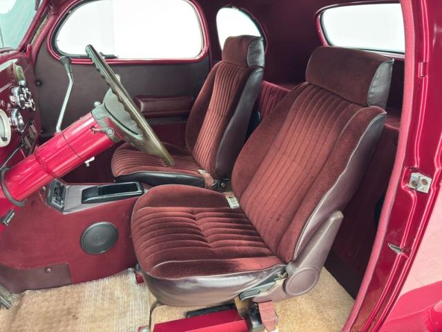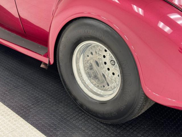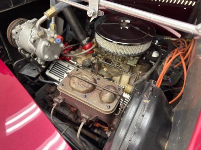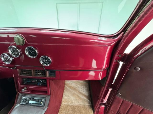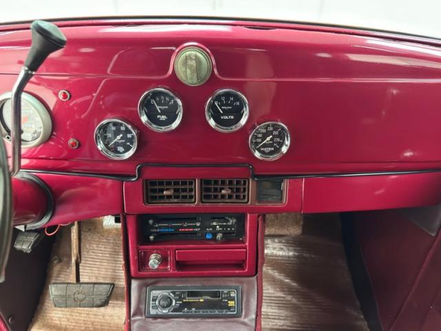Burgundy door panels include a vinyl upper half, stitched cloth lower, and billet style hardware and both present cleanly. 80s/90\'s era bucket seats in burgundy velour occupy the front and other than some compression, remain clean and intact. Behind them is a package shelf and storage wrapped in the same stitched velour and show ready, and this material also covers the tall, center console which has storage bin where a shifter would be and an AM/FM/Cassette radio under the center stack where we find an A/C panel housed in the magenta base. A mid century steering wheel fronts the painted dash which puts an AutoMeter speedometer in front the four more gauges in the center. While here, we noted some rough cut material on the A-pillar outside of the windlace. Tan carpet pieces are on the floor, a burgundy headliner above, and a barren trunk with a tubular boxed gas tank and tubbed wheel wells finish our tour of the interior spaces.