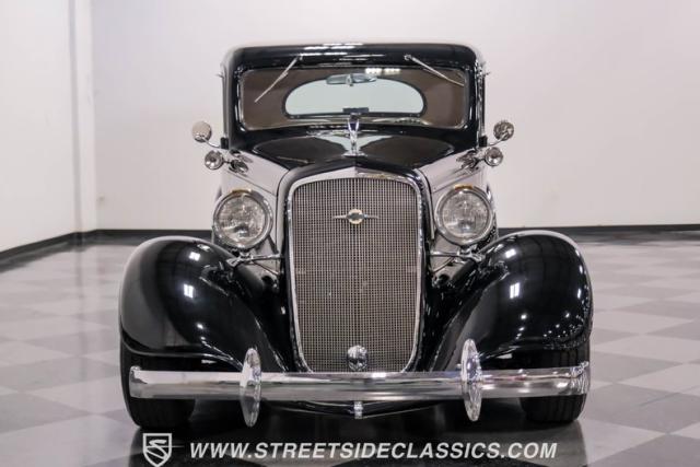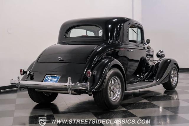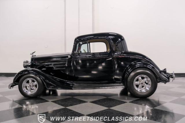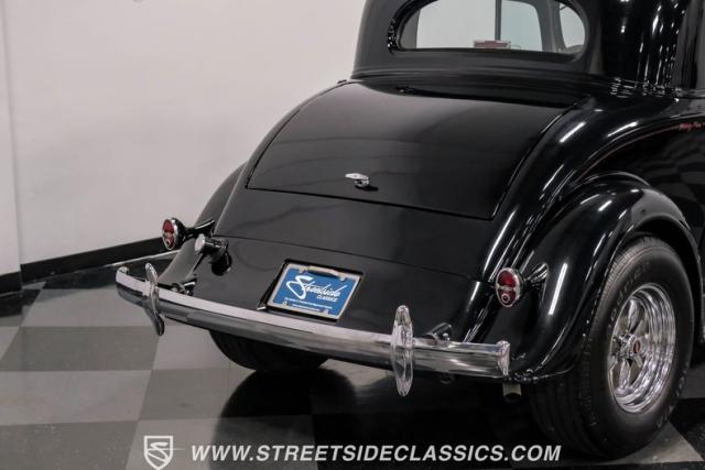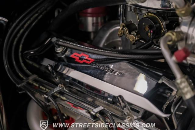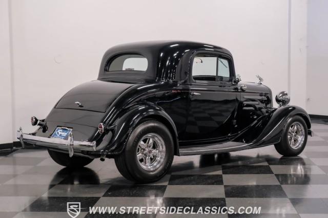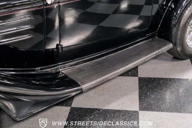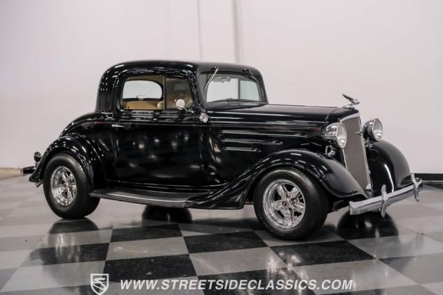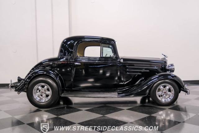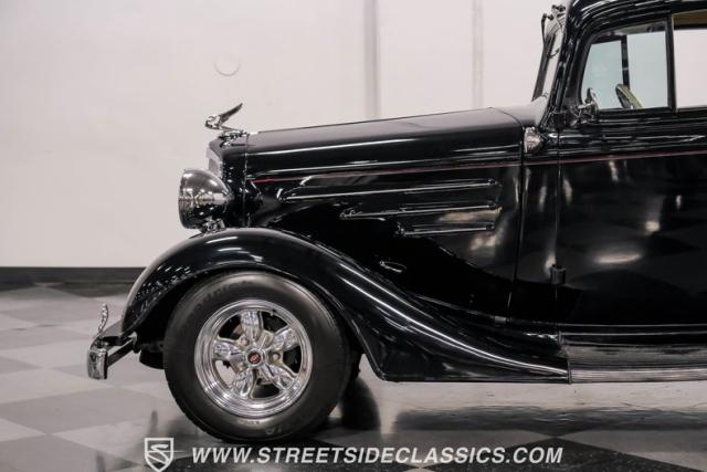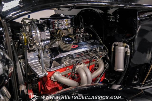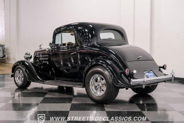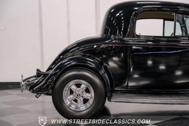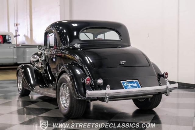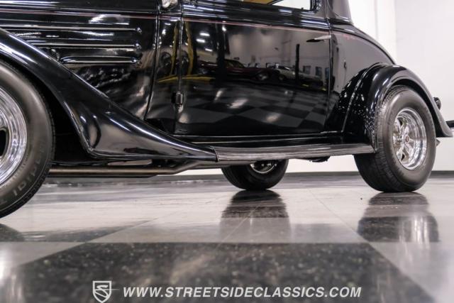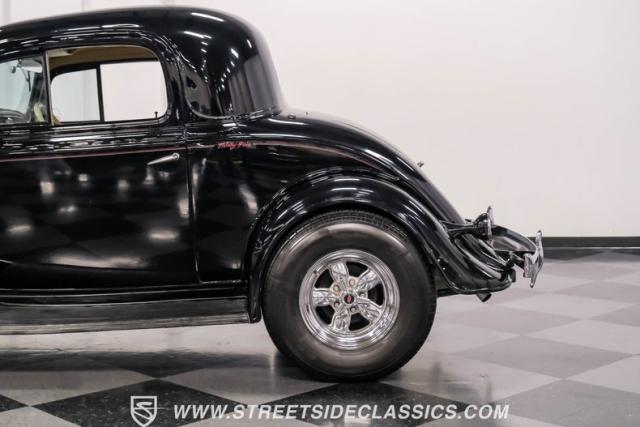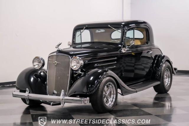Rolling with a pure street rod attitude, this 1935 Chevy 3 Window Coupe flexes serious muscle in midnight black, accented by precision-laid red and gray pinstripes. Custom touches include slick glass running boards, a clean-mounted frenched plate, and blue-dot taillights that add old-school flavor. The all-steel body maintains that true hot rod DNA, while the glass tail panel kicks it up a notch with modern style and the staggered wheel combo - 14-inch front and 15-inch rear with Chevy spinner caps - plants those BFG meats (195/70R14 front, 255/70R15 rear) for a killer rake.