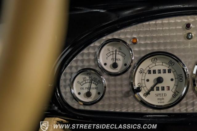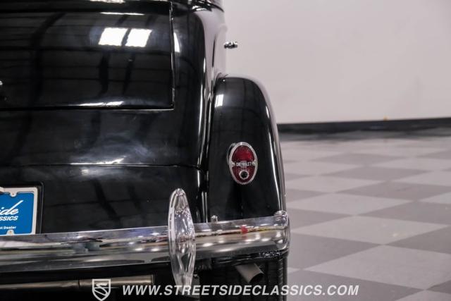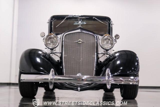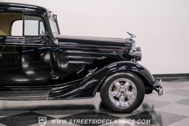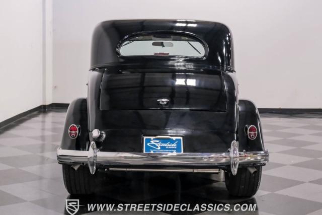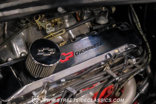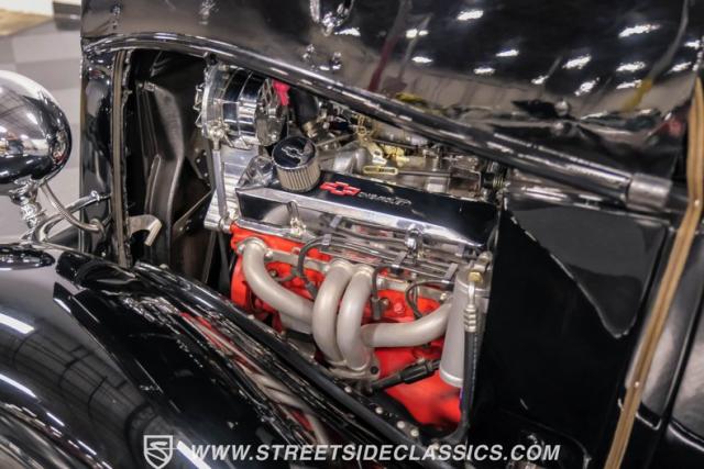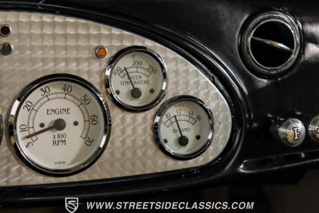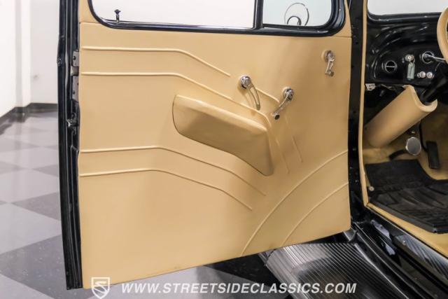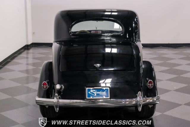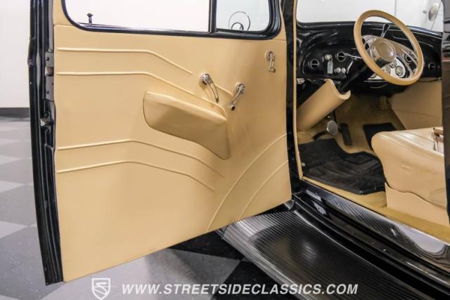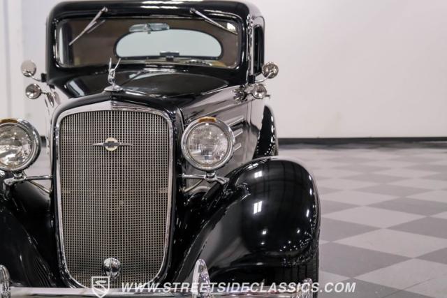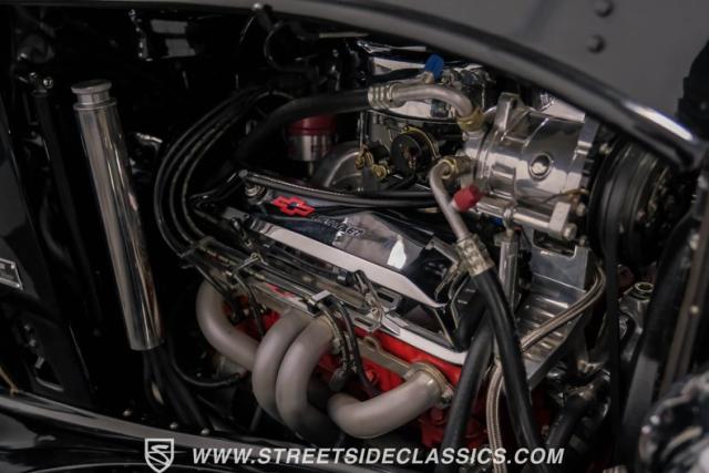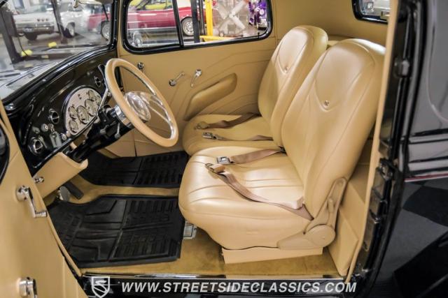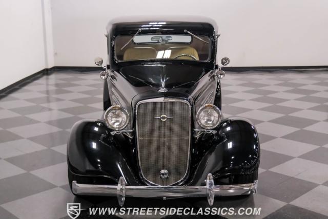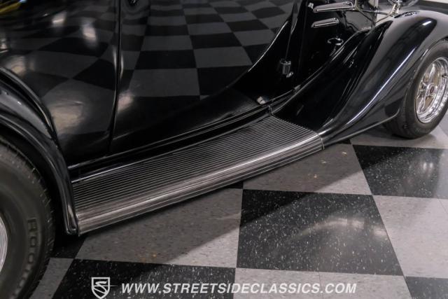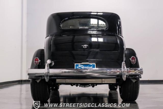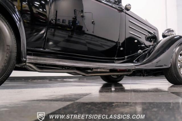 Rolling with a pure street rod attitude, this 1935 Chevy 3 Window Coupe flexes serious muscle in midnight black, accented by precision-laid red and gray pinstripes. Custom touches include slick glass running boards, a clean-mounted frenched plate, and blue-dot taillights that add old-school flavor. The all-steel body maintains that true hot rod DNA, while the glass tail panel kicks it up a notch with modern style and the staggered wheel combo - 14-inch front and 15-inch rear with Chevy spinner caps - plants those BFG meats (195/70R14 front, 255/70R15 rear) for a killer rake.