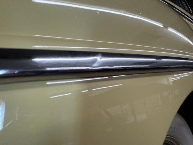 Someone\'s been waxing on and off, because the single stage Maize Yellow paint shines under our lights and wears stainless trim pieces, prominent over the shoulder line and fenders, like linear jewels. The 16-inch wheels are artfully complex and begin body matched steel wheels which are pinstriped in red, then topped by Ford stamped hubcaps augmented by gleaming beauty rings and wrapped in wide white wall tires. A freight train shaped hood ornament tops a Super Deluxe badge, chrome grille and bumper which provide ornamentation along with the rings around the headlights and marker lights. A slight gap issue on the trunk does not detract from the handsome profile back here and deco stamping of the bumper ends. Imperfections include random scratches, chips, scuffs, tarnish spots and a ding on the stainless, some staining on the tan canvas soft top, and some overzealous touch up at a wheel opening.