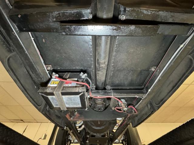 The exposed front axle provides a Cheshire grin in front of the radiator which reads Hot Rod 2 Hell, topped by a chrome skull cap, a nice start to your arrival at Cars and Coffee. From the side, the tires are almost the highest point of the car, but the engine rises above them, as does the bucket cab in line and if your arms are long enough, you can pick up things off the street. Out back, a gas tank is held in place with leather straps and a single Dietz taillight on top of a black frame is the beacon of warning for those behind. A skull wearing the Prussian cross is on the side along with a number 5 in vintage font. 16-inch wheels wear Ford poverty hubcaps and the tires vary front and back with size and tread type. More skulls on the windscreen frame which sits vertically over the body that is painted with thick black paint. It\'s all in clean condition with the appropriate patina look.