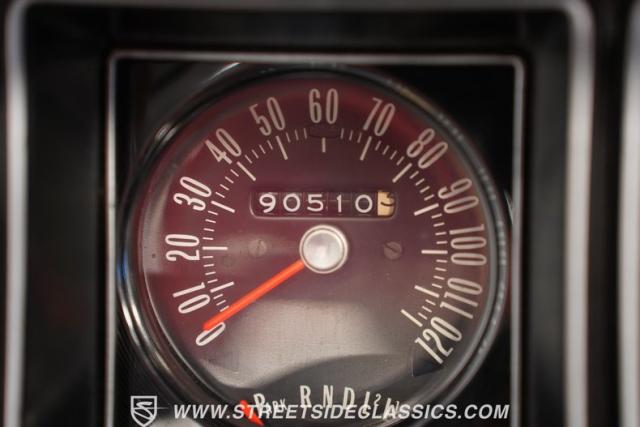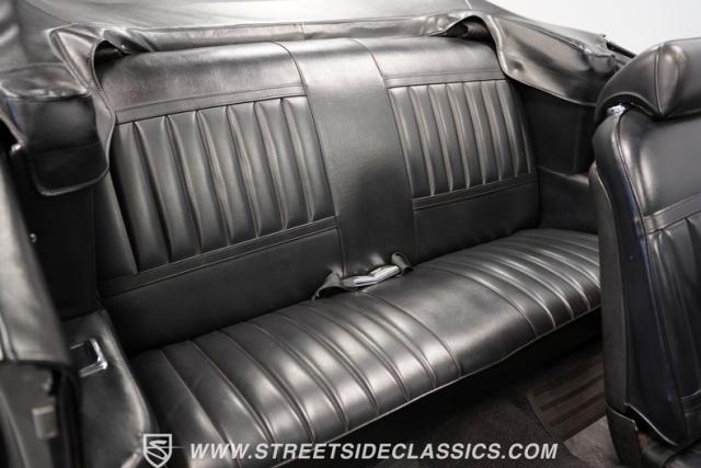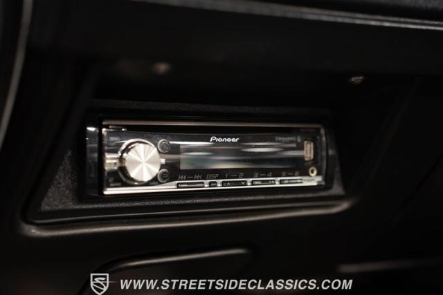 Inside, the black vinyl interior exudes a classic muscle car vibe. Bucket seats offer comfort and support for spirited driving, while the center console with its horseshoe shifter adds a sporty touch. The dash is clean and well-fitted, housing a set of AutoMeter oil, temperature, and volt gauges mounted below for easy monitoring. A Pioneer stereo unit brings modern sound to this classic ride, perfect for cruising with the top down. The door panels and rear seats present well, showing minimal wear and maintaining the car\'s overall sharp appearance.
