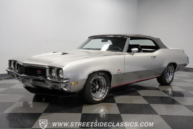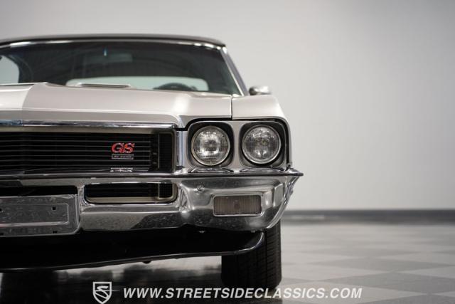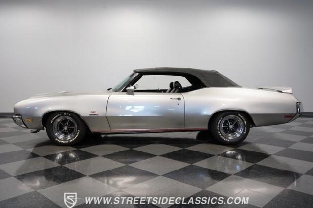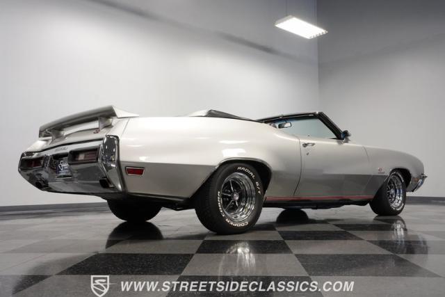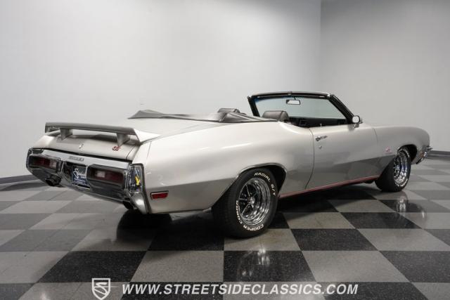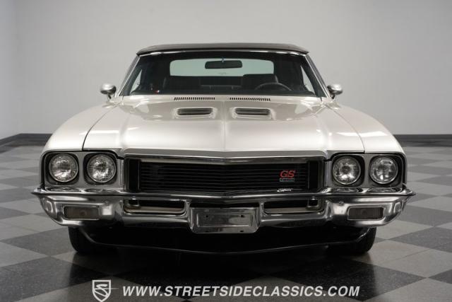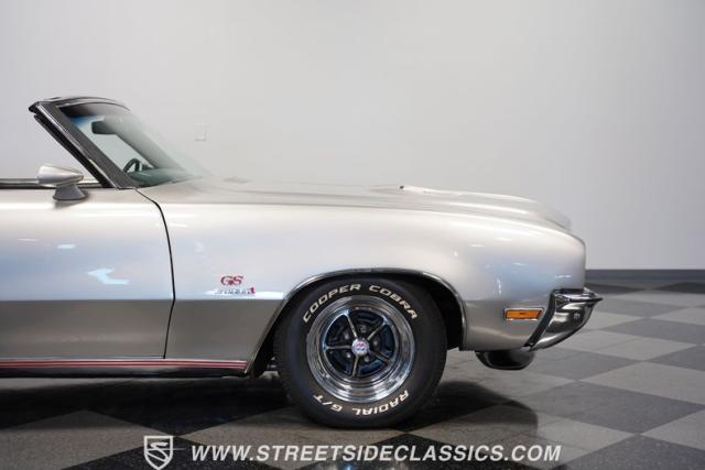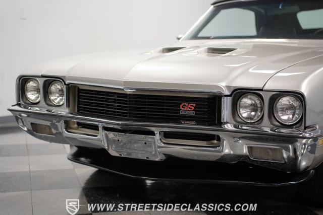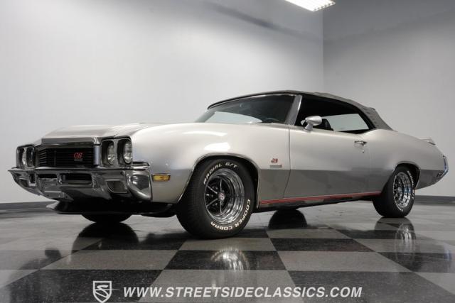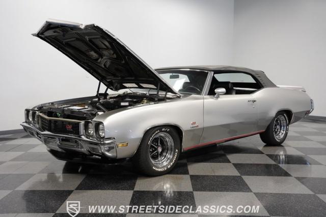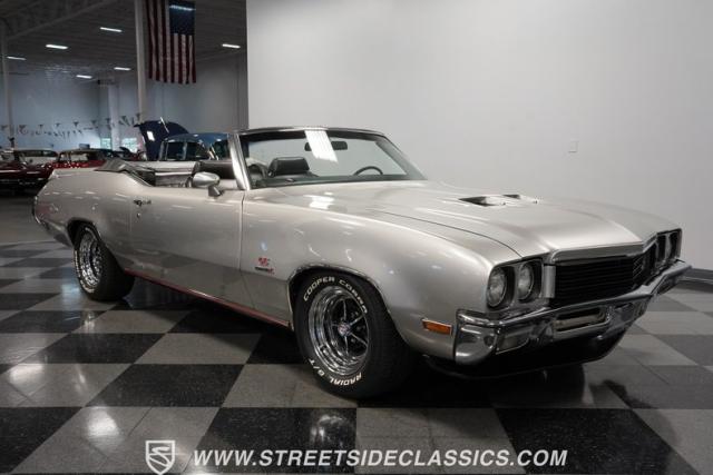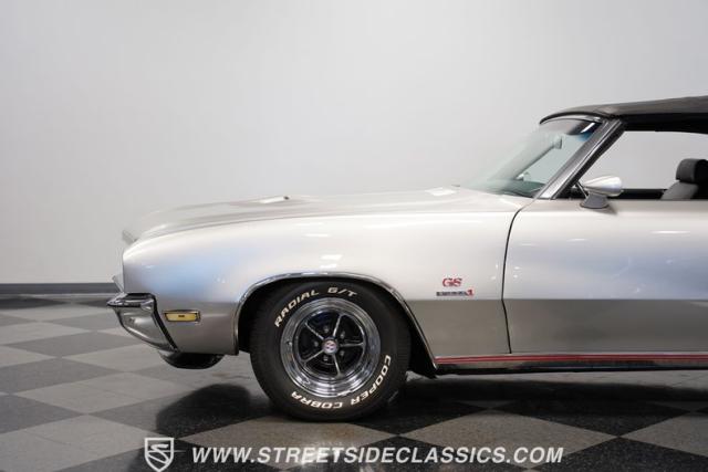 This 1972 Buick GS 455 Stage 1 Convertible Tribute is rare, with only 852 Buick GS convertibles believed to have been made that year. The silver paint job sparkles in the light, accentuating the muscular lines of this classic powerhouse. GS and Stage One decals proudly announce their performance pedigree, while the black convertible top adds a touch of elegance. The chrome bumpers and trim shine brightly, complementing the car\'s overall appearance. Rolling on 15-inch wheels wrapped in meaty 245/60R15 tires, this Buick strikes an imposing stance that commands respect on the road.