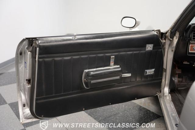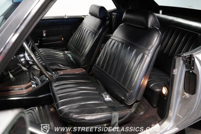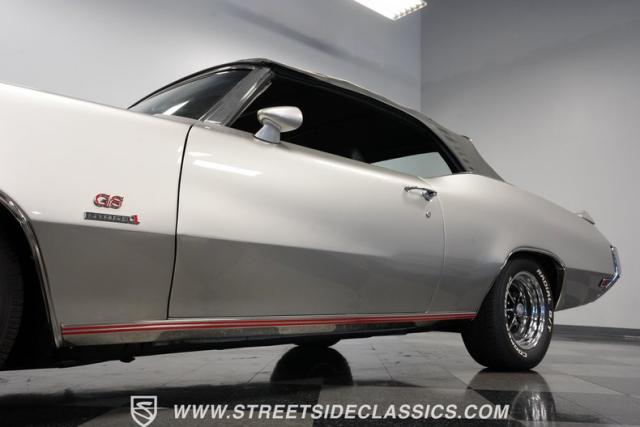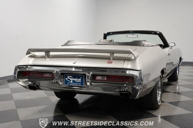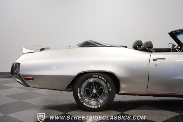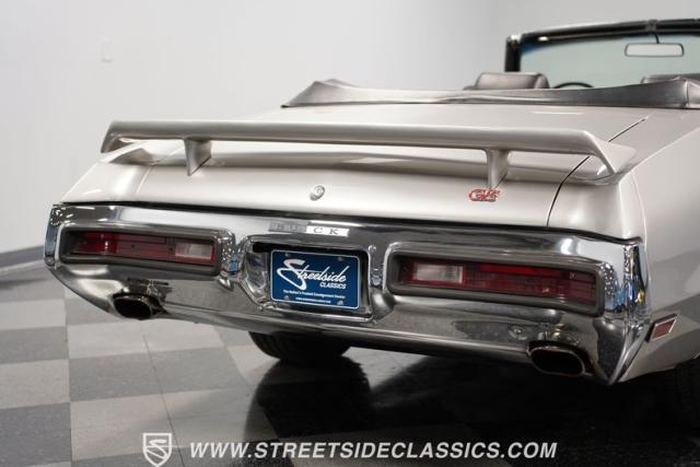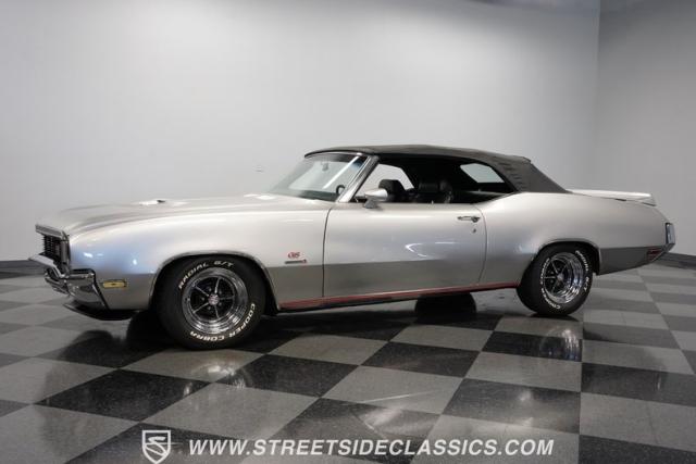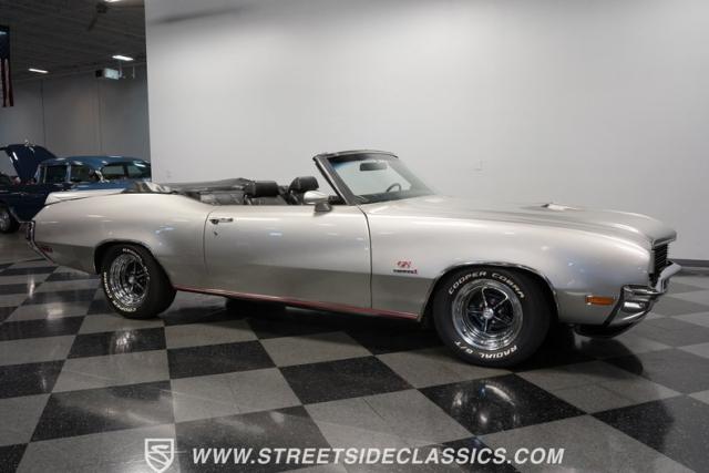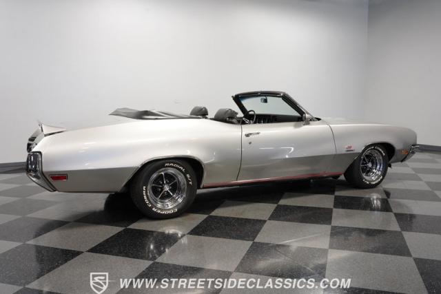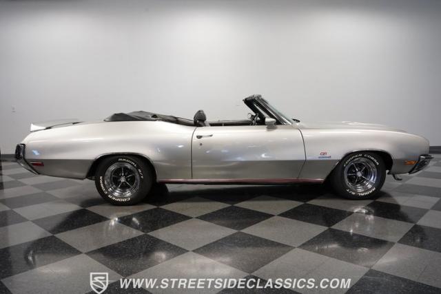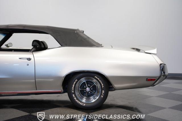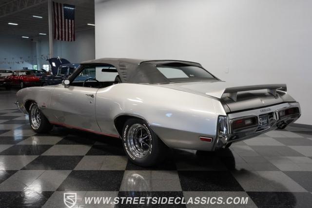 This 1972 Buick GS 455 Stage 1 Convertible Tribute is rare, with only 852 Buick GS convertibles believed to have been made that year. The silver paint job sparkles in the light, accentuating the muscular lines of this classic powerhouse. GS and Stage One decals proudly announce their performance pedigree, while the black convertible top adds a touch of elegance. The chrome bumpers and trim shine brightly, complementing the car\'s overall appearance. Rolling on 15-inch wheels wrapped in meaty 245/60R15 tires, this Buick strikes an imposing stance that commands respect on the road.