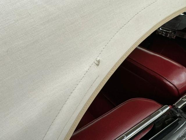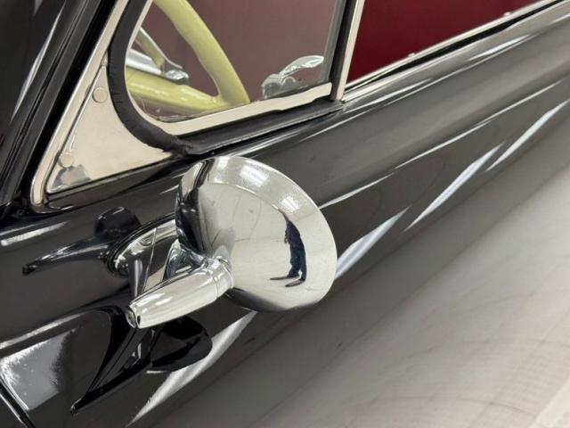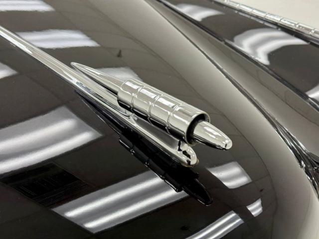 Velvet Black paint covers the extent of this large car, and the grille does show the extra shine with molding between the slots and the large rectangular piece in the center. The wraparound bumper with large bumper guards sits further outboard than in previous years and stainless steel rocker panel moldings and gravel guards were specific to the Regal Deluxe. Fender ornaments with lights leading the way are beautifully streamlined and designed. The hood ornament resembles a bomb while the Studebaker crest sits boldly on the nose. Everything is in wonderful condition. The front fenders also feature a vent behind decorative slats and the rear fender includes skirts over the rear wheels. The ivory canvas top has a bit of discoloration, a few loose threads, and a small hole or two, but is in good condition with its glass window in place. The rear taillights have distinctive four segments that helped differentiate it from the Studebaker Champion. We note a scratch near one of the skirts as the only defect worthy of documentation.