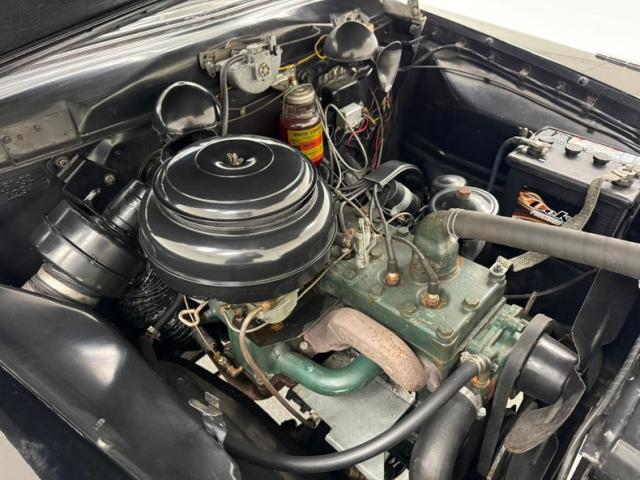 The car is equipped with a 226ci L-head inline 6 cylinder engine rated at 94 horsepower and mated to a Borg Warner T86E 3-speed manual transmission with overdrive which our consignor states works! Power is transferred to the rear wheels where 4.55 gears make the spin work. Drum brakes are found at each corner. The engine bay appears very original, and the block is painted the original olive green. The glass jar of white lubricant for the working automatic lubricator is a fascinating throwback and rare to find intact.