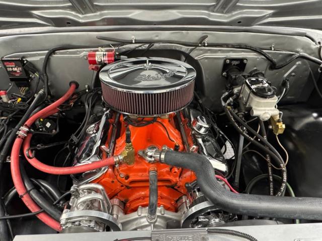 We open the hood to find quite a bit of filler on the leading edge itself. Inside is a gleaming 402ci V8 with FiTech electronic fuel injection and a 4L60E 4-speed automatic transmission that routes power to the 10 bolt rear and front axle, both with 3.08 gearing. An orange block, chrome valve covers, and lots of polished parts makes this one a candidate for show and tell!