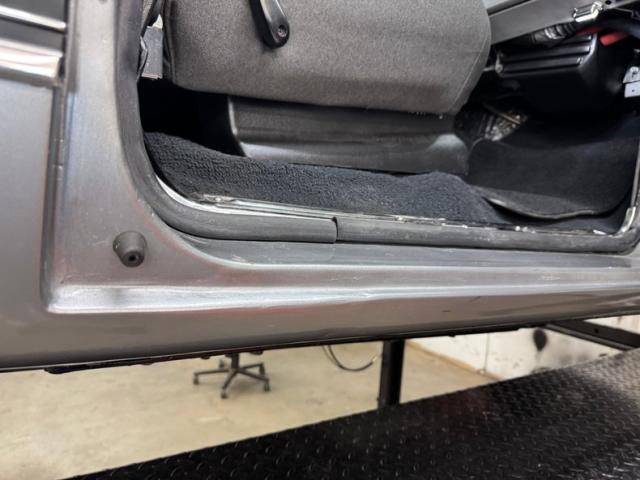 Gray cloth door cards fit nicely in the color matched inner doors with a subtle rib patterning, while the bucket seats wear covers of varying shades of gray to include panels that match the doors. The rear bench receives the same, clean treatment, and the floor is smoothly covered with black carpeting. An aftermarket steering wheel adds some flare and fronts a standard dash with newer white faced gauges and digital readouts. Blue digits illuminate the center where an AM/FM/CD radio with AUX/USB resides along with an updated climate panel. The shifter is on the column while the range selector is on the floor, just ahead of an added center console, dressed to match, and retaining three cupholders and lockable storage.