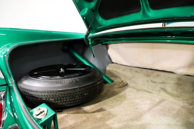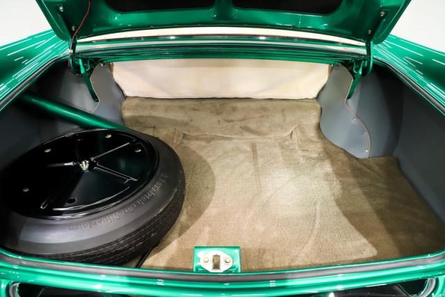 TRUNK COMPARTMENT: Under the trunk lid and the jamb are painted as slick as the car. It has reproduction weather strip, decals and liner kit. The floor is carpeted, well liner was replaced. Restored spare with a 5th matching reproduction white wall. The jack assembly is complete and mounted properly. Trunk light works.