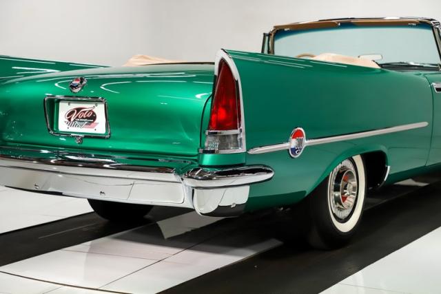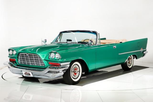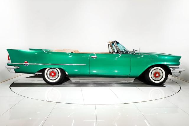 EXTERIOR: The 1957 is considered the classic year of the 300 letter series. It was the first year offered in a convertible. Up front is the \"yawning grill\". In back are the tall tail fins which Chrysler referred to as stabilizers, they actually did increase stability! When I say the body is laser straight, I mean it. Literally every square inch is mint. There is zero rust, damage or body work showing. Everything fits precisely. Repainted rare and eye catching Parade Green metallic. It is laid out evenly and polished like a piece of glass. Even the jambs are painted as slick as the outside. Every single piece of chrome is restored to show quality. The grill is restored, even the window frames sparkle. The stainless was straightened and polished. The power antenna works. All of the glass was replaced. The weather strips and seals were replaced. Very rich black cloth power convertible top. Even the top framework was apart and restored. This one has the correct hubcaps in pristine shape with reproduction white wall tires. You may see others with wire wheels, those were actually not correct.