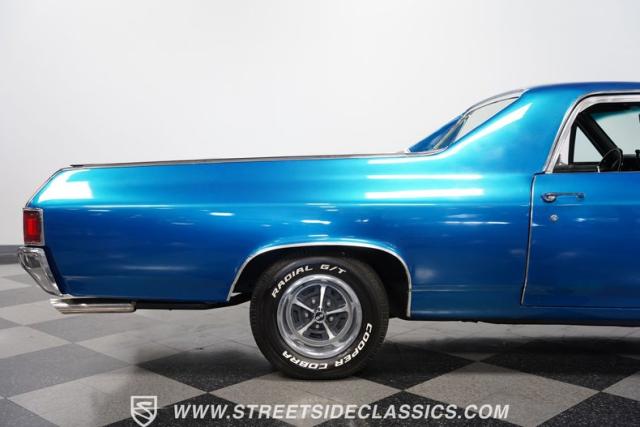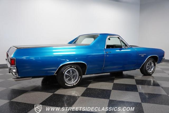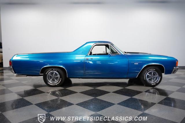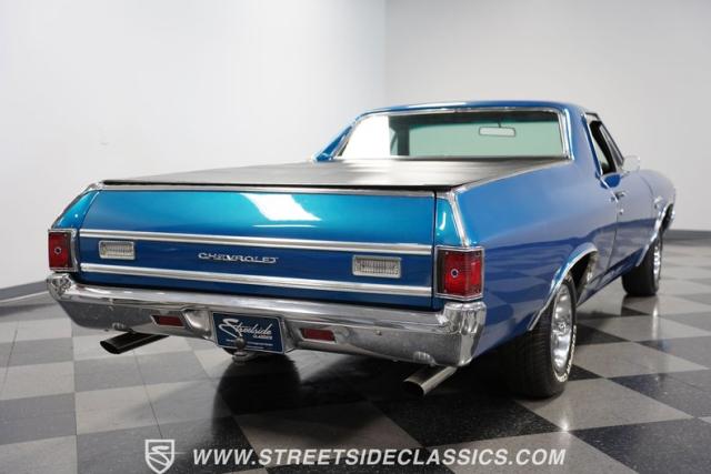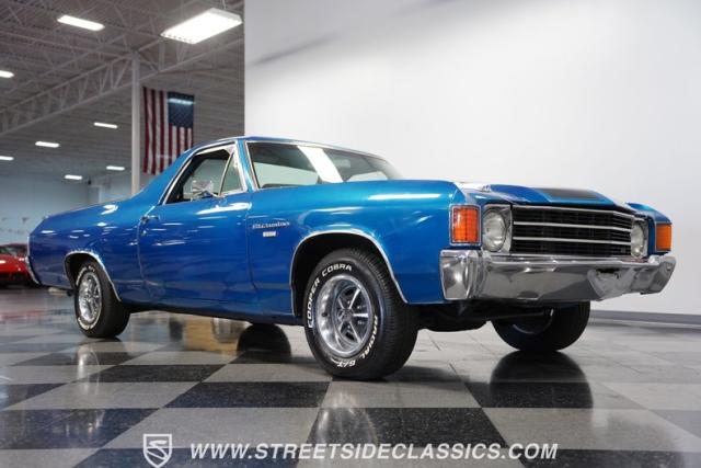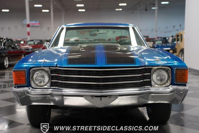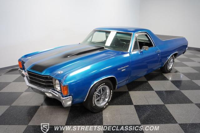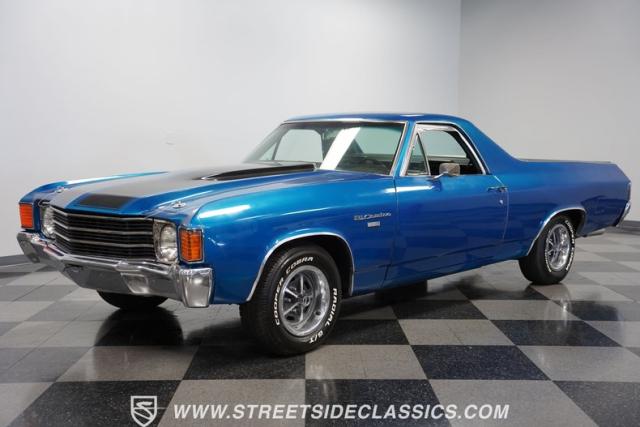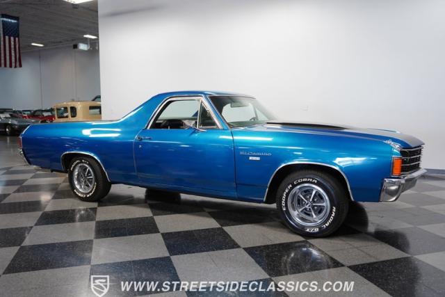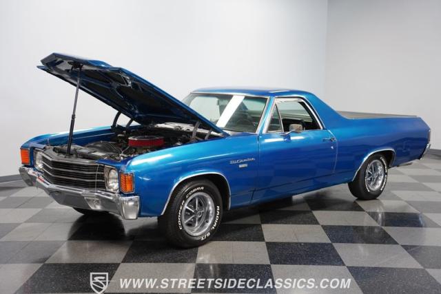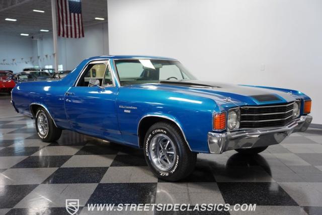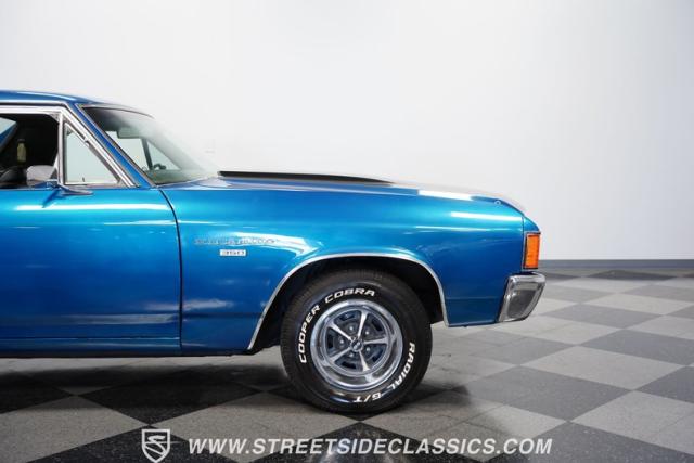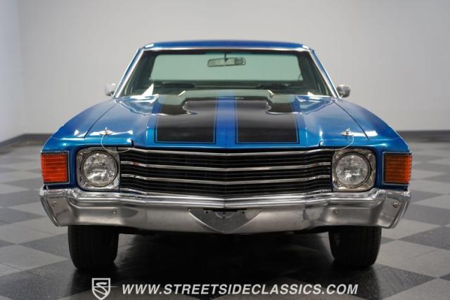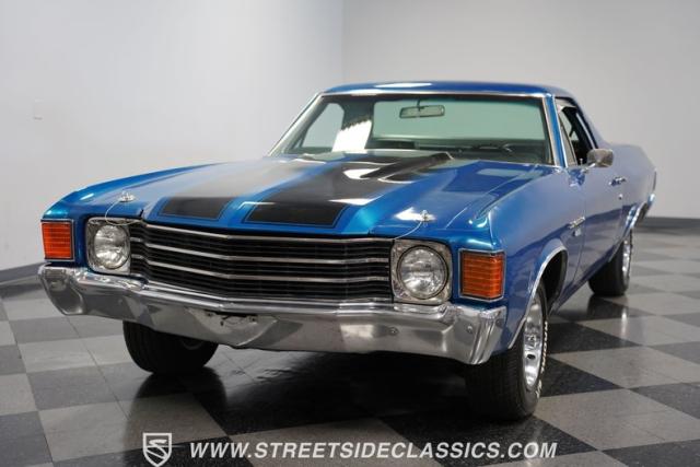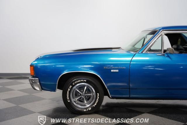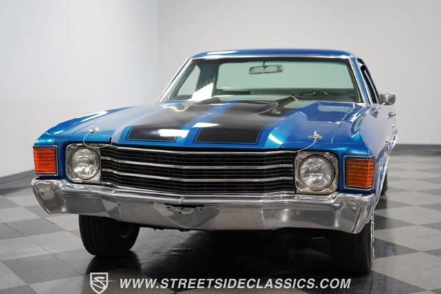 This 1972 Chevrolet El Camino, with metallic blue paint that pops in the sunlight and black racing stripes, is a sleek fusion of car and pickup ready to cruise. The cowl induction hood, blackout grille, hood pins, and 14\" Magnum 500 wheels wrapped in 215/70R14 Cooper Cobra Radial T/A tires with SS badges give it the expensive upgrades of a Super Sport tribute, minus only the SS body badges. The blue-dot taillights add another nice exterior touch to this cool classic.
