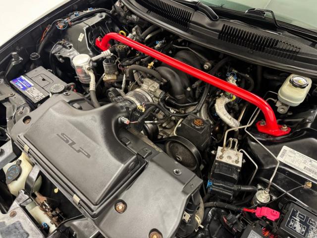 Under that tall hood is the 5.7 liter LS1 V8, rated at 305 horsepower and adorned with an SLP air intake and electronic fuel injection. It\'s mated to the mighty Tremec T56 6-speed manual transmission and power is routed to the 10 bolt rear axle with 3.42 gears and Positraction. A bright red strut brace bridges the bay and adds a touch of color to the mostly black powerplant.