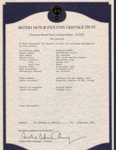 Check out this one owner Southern California time capsule! It’s not everyday that one of these comes in with every record since new and having a true MG enthusiast as it’s care taker for 45 years. This one is finished in Brooklands Green with Autumn Leaf vinyl interior per the included Heritage Certificate and original window sticker. It was professionally repainted in 2012 and still looks like brand new! The original Rostyle wheels were restored and external options include a newer Black soft top, matching Tonneau and boot cover, dual chrome mirrors and an upgraded front chin spoiler from a Limited Edition model which really adds a great look to the front end! Under the hood sits the matching number 1.8 Liter engine with just over 99k original documented miles that runs amazing and passes the difficult California emissions test without issue. The 4 speed manual transmission shifts with ease and takes you back to the feeling of driving a fun little sportscar through the winding mountain roads or up the Coast. The interior is original with it’s headrest bucket seats and still retains it’s factory steering wheel, AM/FM Cassette Stereo, seat belts and factory Smiths gauges all in working order. This California car still has it’s original personalized Blue license plates including the original selling dealers plate frames from Whittlesey Motors in Torrance California. A few extras include a few sets of keys including the originals, matching spare tire, car cover with storage bag, a few spare parts for servicing and a stack of records with brochures and advertisements from back in the day. Join the MG Club, go on some drives, take home a trophy and meet some great people!
