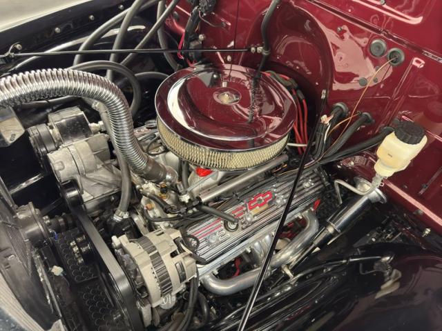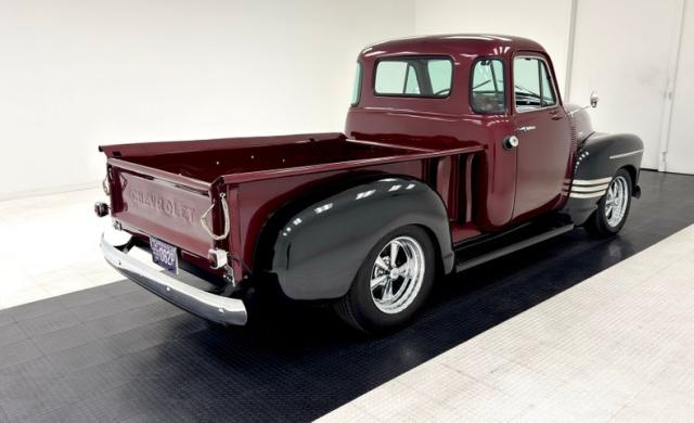 Garnet red on black fenders makes for a striking presentation, especially when enhanced with strips of body trim on the front fender in a unique configuration that makes this truck stand out from the crowd. Its stance is classic street rod, hunkered down over 17-inch Cragar wheels and staggered size tires, giving the truck an aggressive profile that\'s also sleek, a word likely not used in \'52 to describe the Chevy truck. Bright contrast to the black is found in the broad crossmembers of the grille and robust front bumper and out back, it\'s a bumper and diminutive tail lights that provide some contrast. The cab is perched on multiple posts as the five windows open up a greenhouse and the tall windshield provides light and visibility. Stainless rails and flawless oak planks dress the bed with show worthy coverage and a single scuff on black paint is the only exterior imperfection.