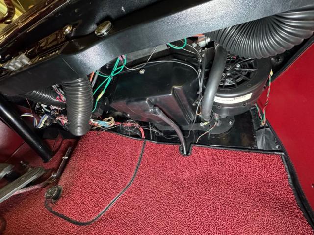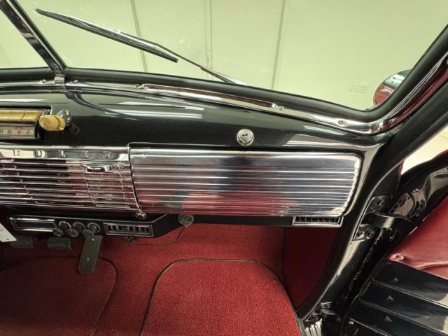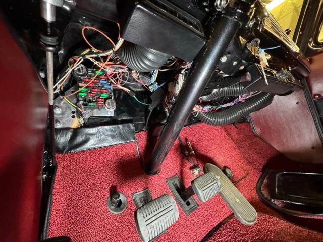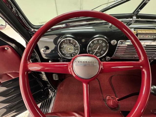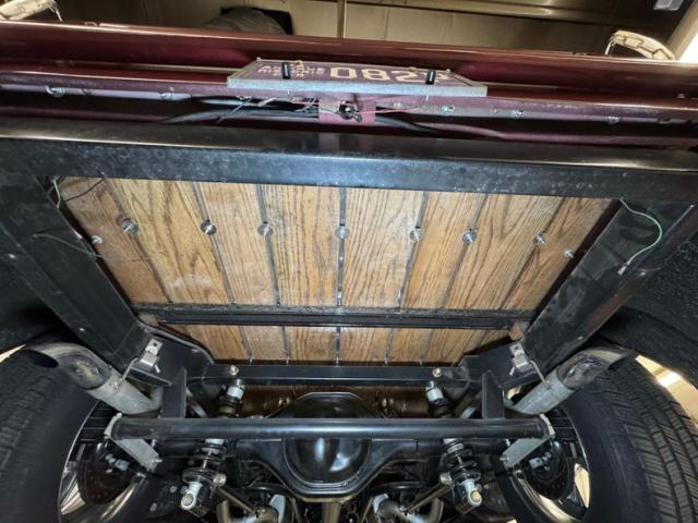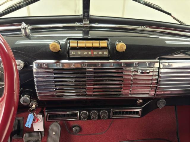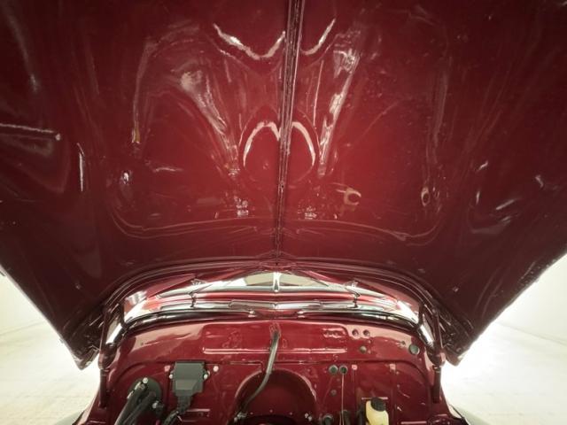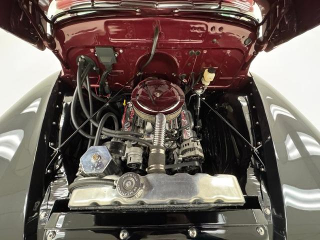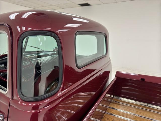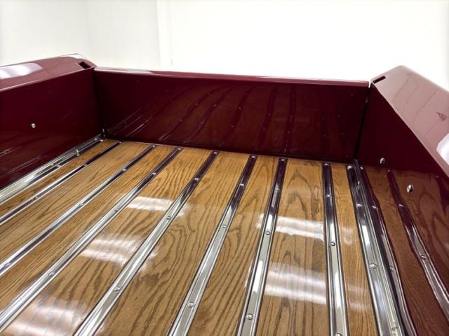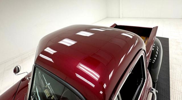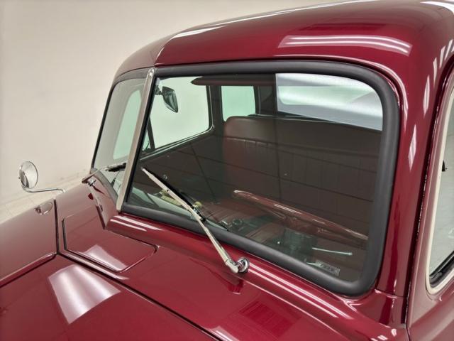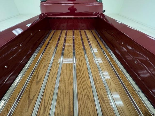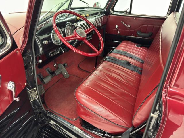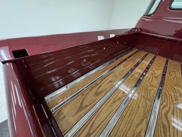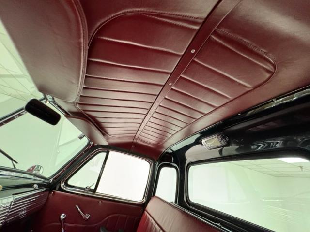 Red vinyl door cards top glossy black paint on the inner doors for a tidy presentation while the front bench takes stitch patterned vinyl and surrounds it with black piping, all in very good condition. We don\'t see a lot of red steering wheels, but this truck has one and it\'s as glossy as a wet piece of candy, in front a black painted dash with standard gauges and knobs bringing occupants right back to 1952. Ivory switchgear on the AM radio helps too, over the center chrome grille and added A/C and heat system below. Red loop carpet on the floor is also adorned with black piping and trim and is fantastically clean while a red vinyl headliner, stitched and riveted, tops off the cabin with perfection.
