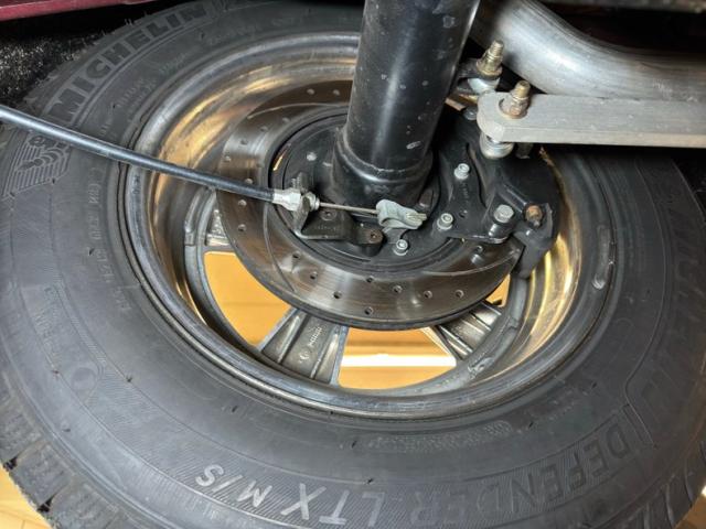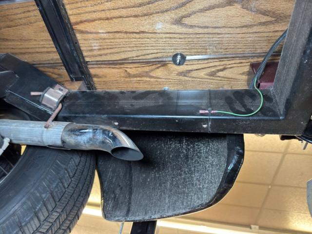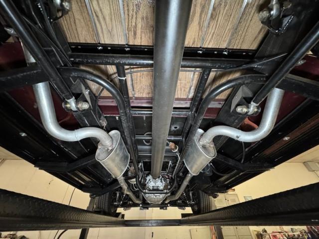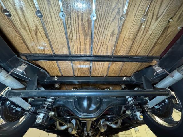 Super clean is how we find the underside with no drips and no surface rust to speak of. The dual exhaust runs from the headers to a pair of Xlerator mufflers, then around the 4 link and exiting via chrome tips under the truck. That 4 link combines with coil overs to make the back suspension while coil overs are found up front.