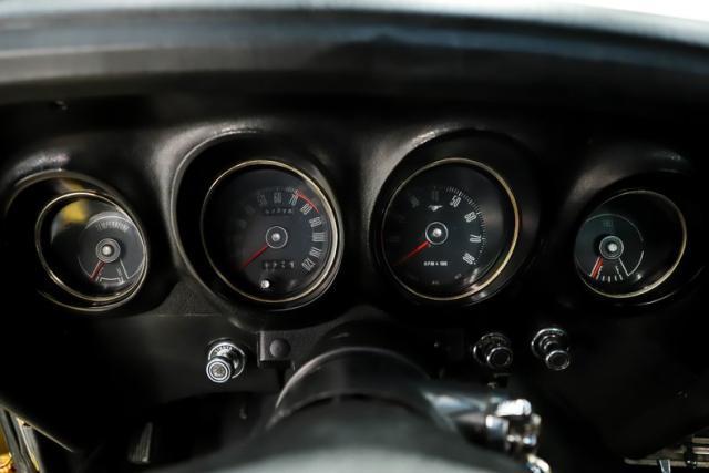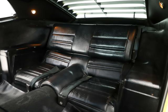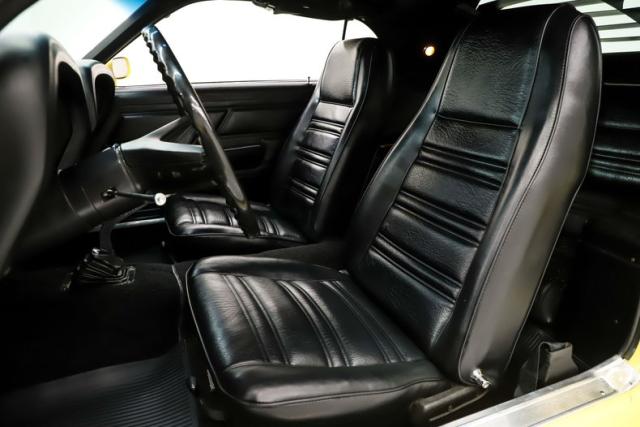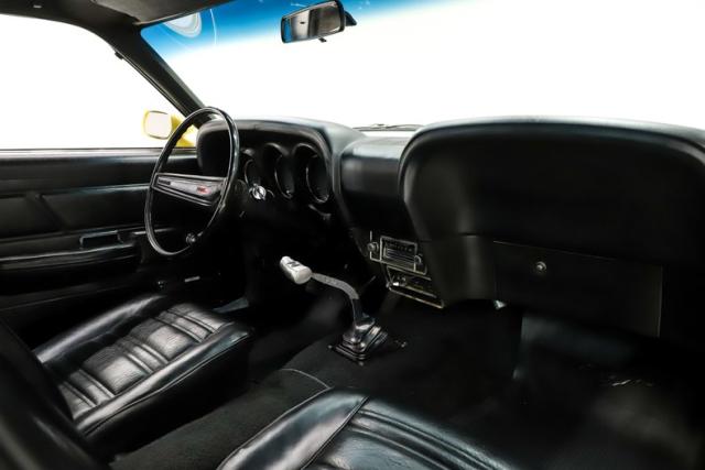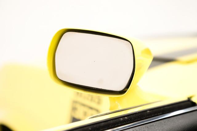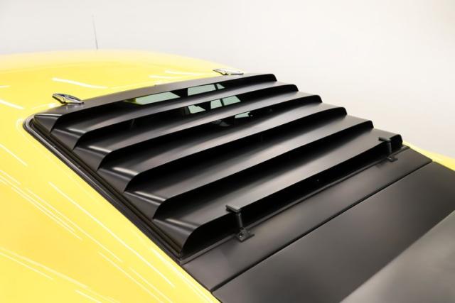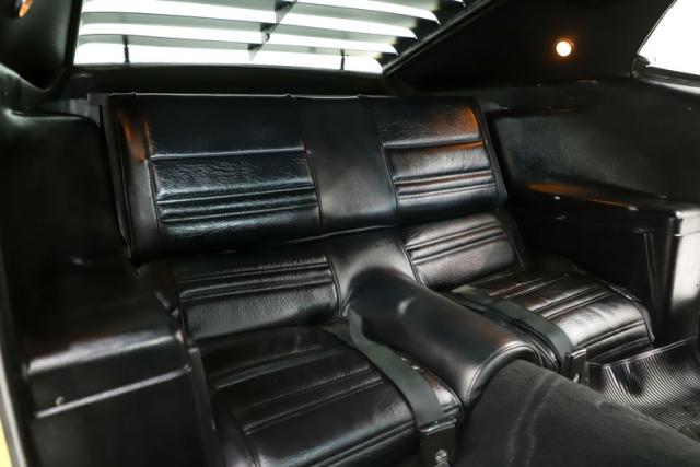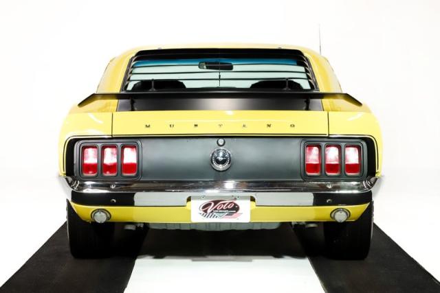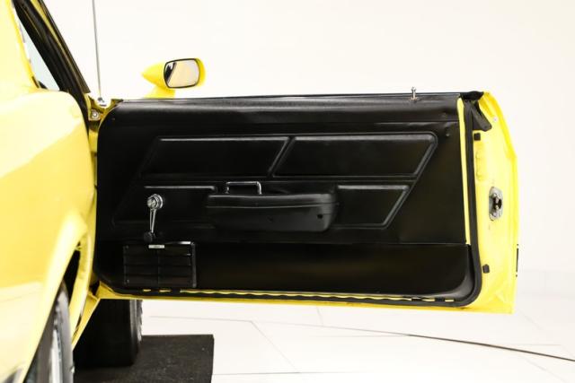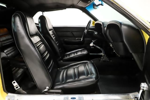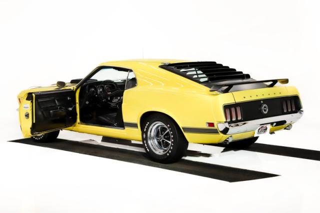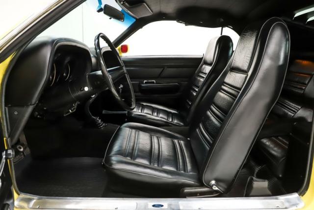 EXTERIOR: The fastback looks are killer and the Boss option elevated it even more! The paint is over 20 years old and in my opinion it\'s show quality. I also believe it has clean metal that is absolutely straight with no signs of rust or damage. It fits very nicely, the panels look original and the front fender lips are rolled which was on Boss 302s only. Repainted its original Grabber Yellow and it is polished smooth and glossy. It also has the correct reflective stripes on the sides, flat black stripes on the hood, trunk and tail panel. Dressed to the nines with spoilers, louvers, racing mirrors and of course the shaker hood with racing pins. The chrome is sparkling, the weatherstrips and windshield were replaced. It\'s sitting on 15 inch Magnum 500 wheels wrapped in reproduction Firestone Wide Oval tires.
