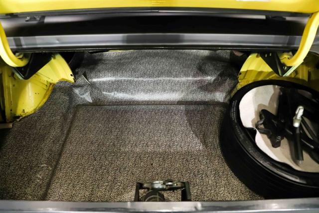 TRUNK COMPARTMENT: It is clean and complete, under the trunk lid is painted real nicely and has the stickers and prop rod. Inside is solid original metal with a reproduction mat, space saver spare tire and jack assembly.