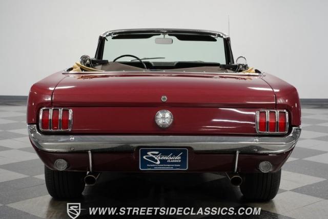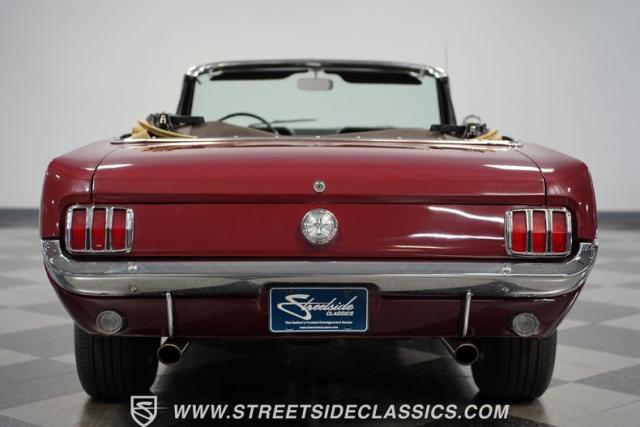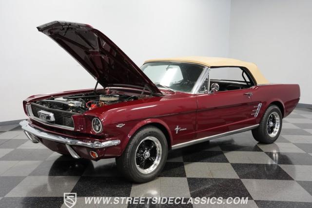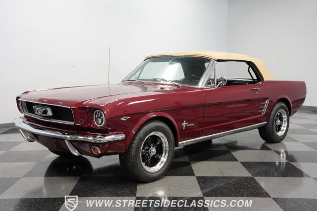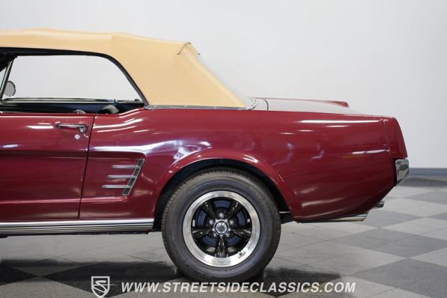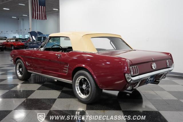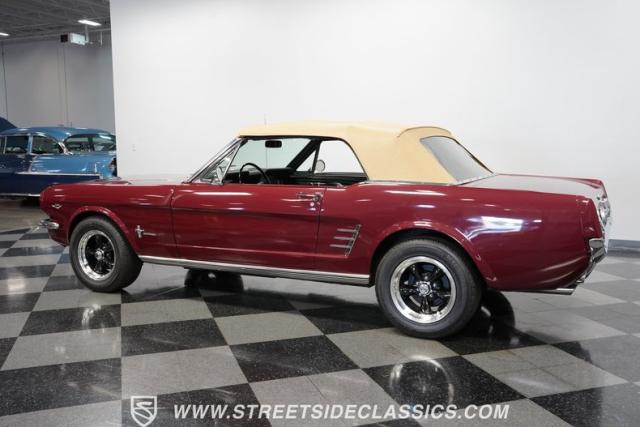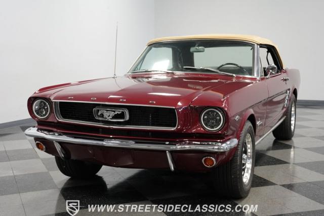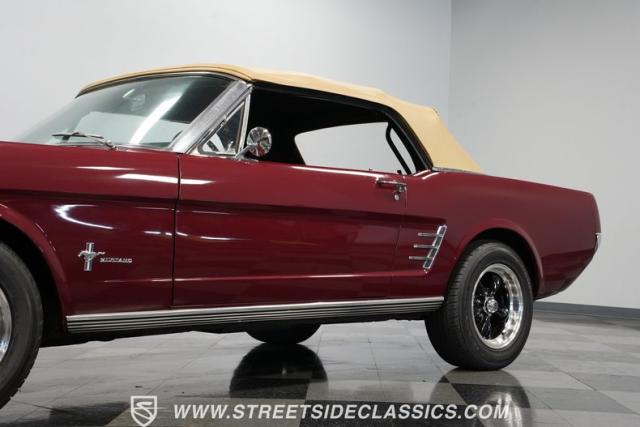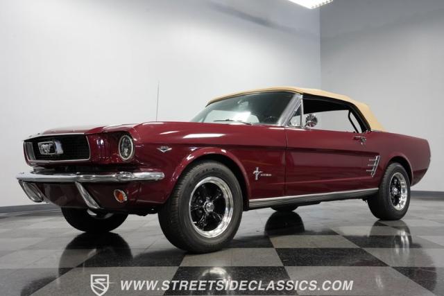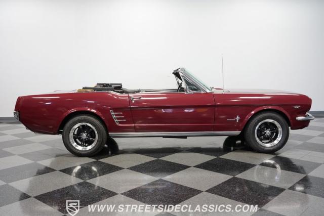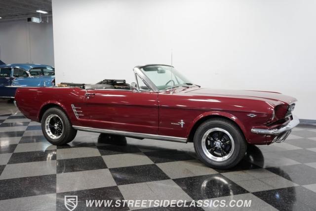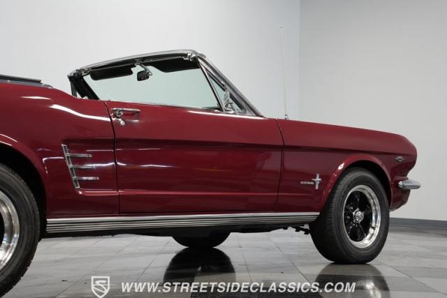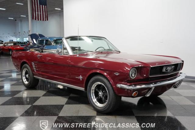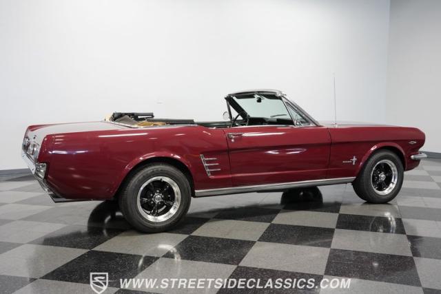 This 1966 Ford Mustang Convertible flaunts its factory-correct Vintage Burgundy paint, a color that defined the \'60s muscle car era. The sleek profile is accentuated by 15-inch Black American Racing Torque Thrust wheels wrapped in Kumho 225/60R15 tires. A black manual convertible top adds contrast and versatility, while dual exhaust pipes signal the V8\'s potent rumble.