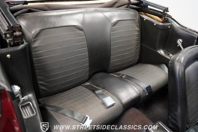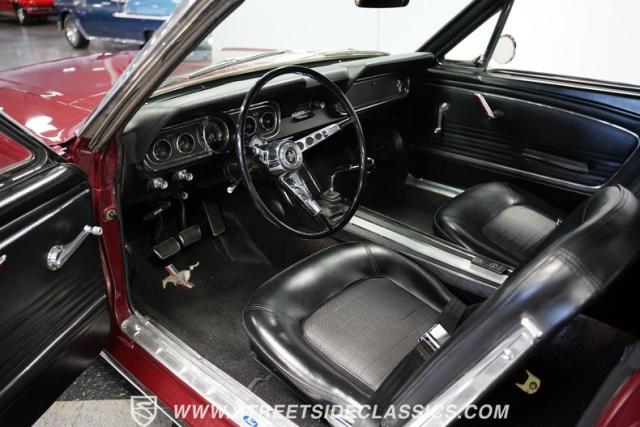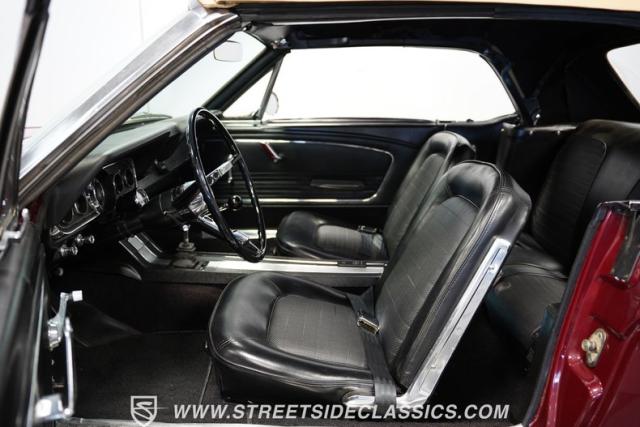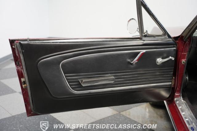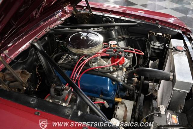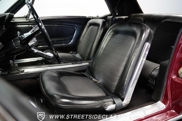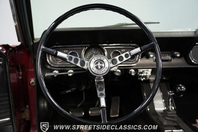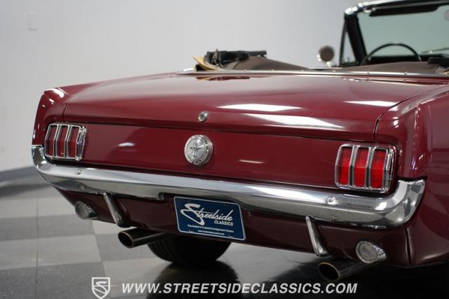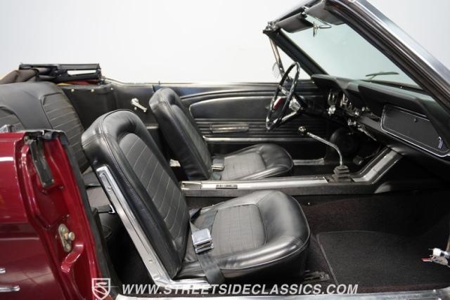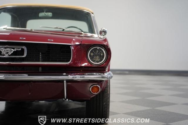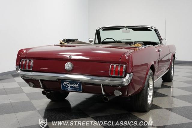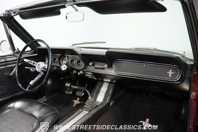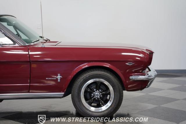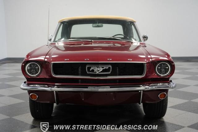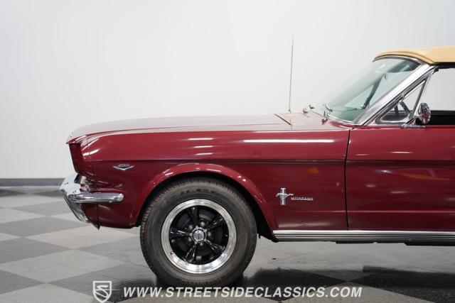 This 1966 Ford Mustang Convertible flaunts its factory-correct Vintage Burgundy paint, a color that defined the \'60s muscle car era. The sleek profile is accentuated by 15-inch Black American Racing Torque Thrust wheels wrapped in Kumho 225/60R15 tires. A black manual convertible top adds contrast and versatility, while dual exhaust pipes signal the V8\'s potent rumble.