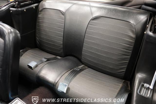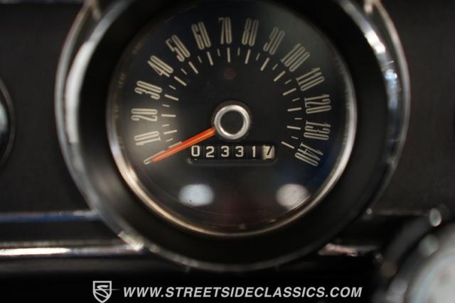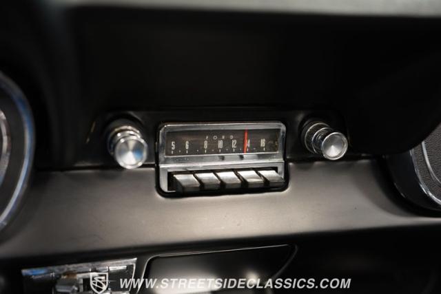 The dark charcoal interior is a well-preserved slice of \'60s automotive design. Bucket seats, door panels, and dash pad showcase quality craftsmanship. A center console houses the shifter for the 5-speed manual transmission. Factory gauges remain clear and functional, complemented by a Sunpro tach on the steering column for performance monitoring. An OE radio maintains authenticity, while a Sony stereo offers modern audio options. Aftermarket speakers in the front kick panels complete the sound system upgrade.