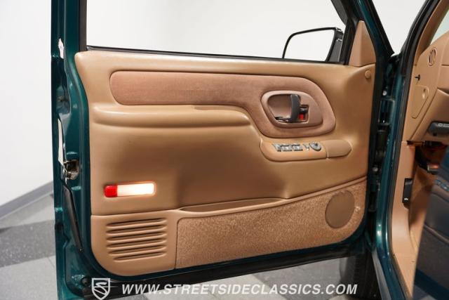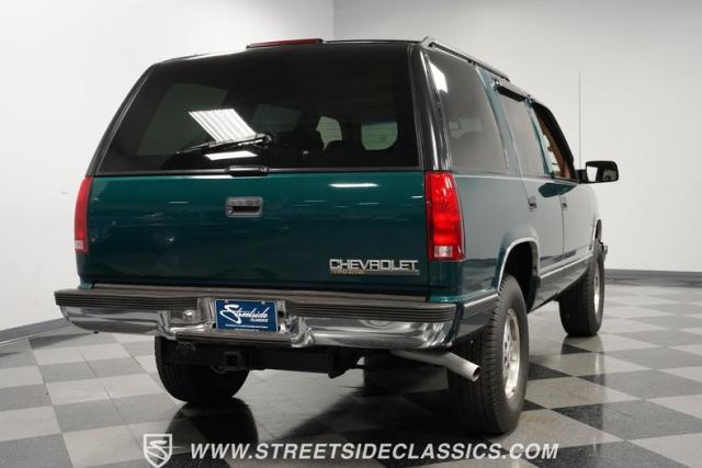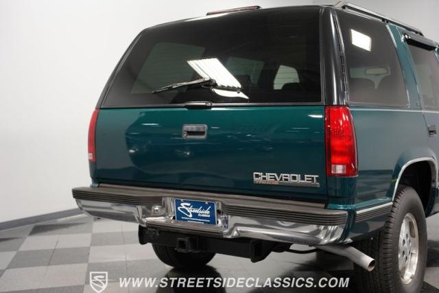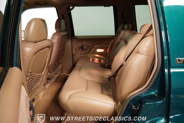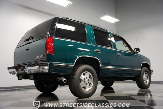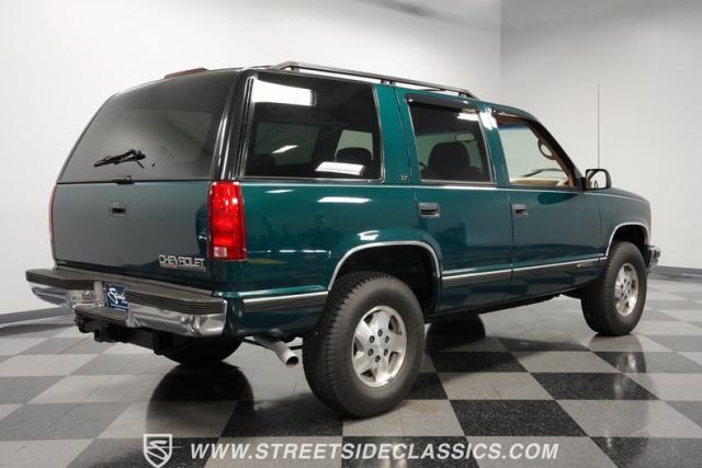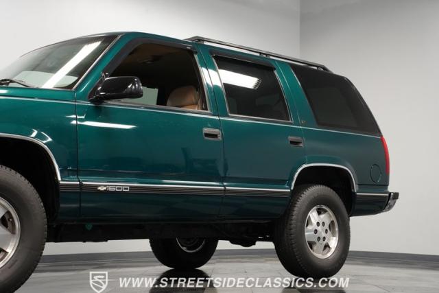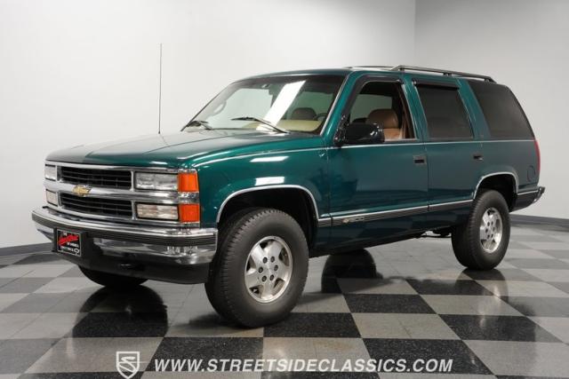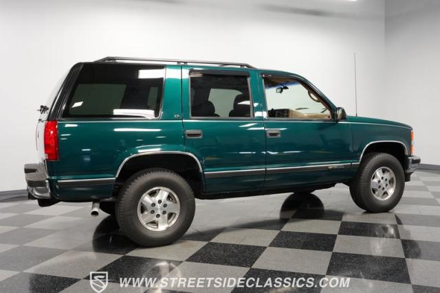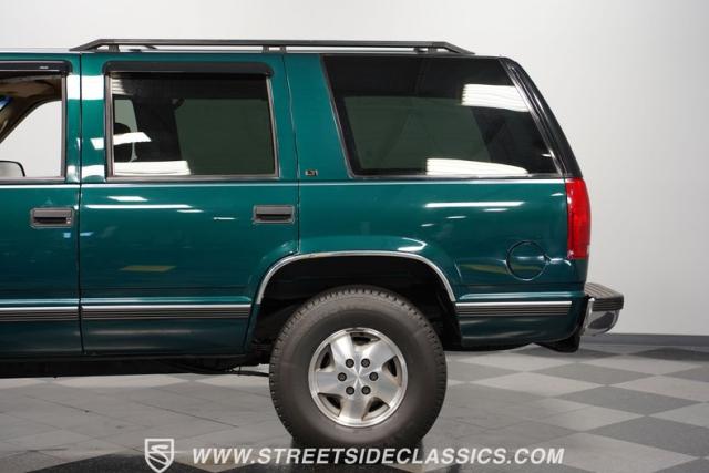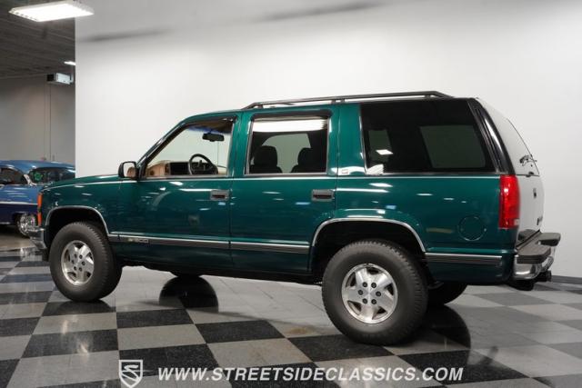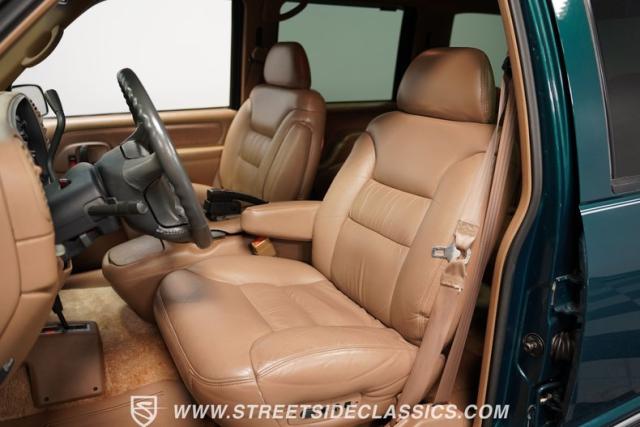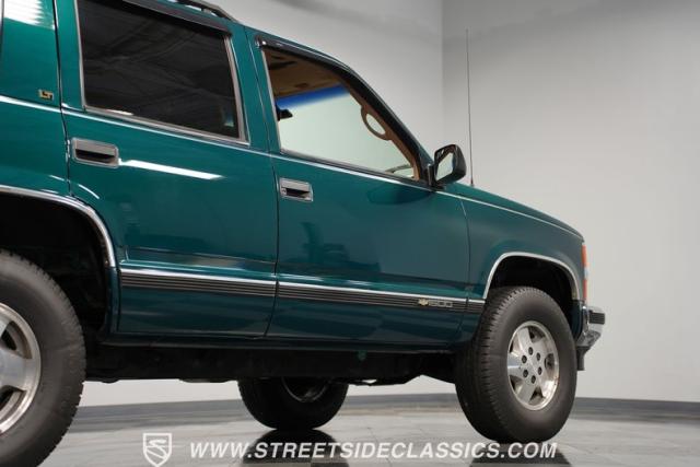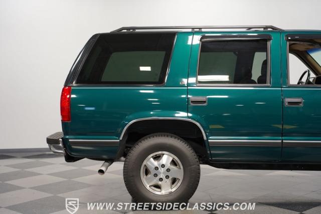 This 1995 Chevrolet Tahoe LT 4X4 boasts a mere 49,687 miles - a rare find for a nearly 30-year-old vehicle. Its Emerald Green Metallic exterior exudes a bold presence, perfectly capturing the essence of 90s SUV design. The LT 4X4 package gives this full-size SUV an authoritative stance, further enhanced by factory wheels, a practical roof rack, and functional rain guards. Privacy glass adds an air of exclusivity. With meaty 265/75R16 tires, this Tahoe is equally prepared for city streets or rugged terrain.