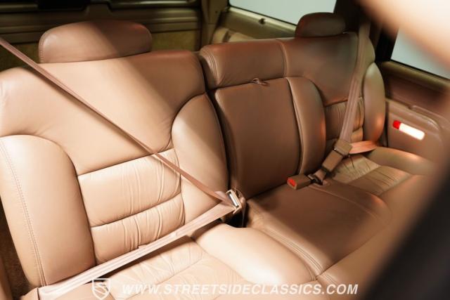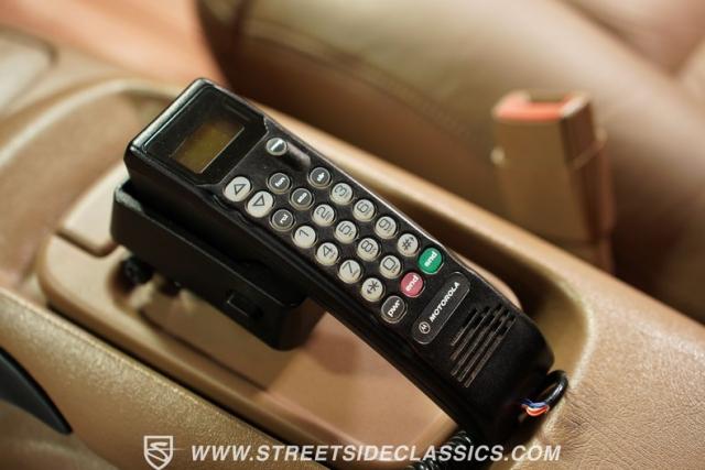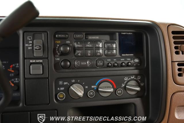 Tan leather adorns the spacious interior, blending luxury with utility. The driver benefits from a power-adjustable seat, while tilt steering and cruise control enhance long-distance comfort. Electric locks, windows, and mirrors offer modern convenience. An aftermarket trailer brake controller suggests this Tahoe\'s towing prowess. A unique feature catches the eye - a vintage Motorola telephone mounted on the center console, a cool relic from the early days of mobile communication. The AM/FM cassette player stands ready to pump out your favorite 90s tracks.