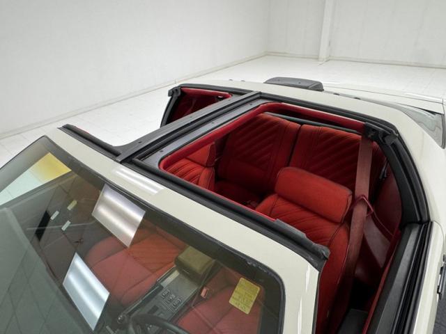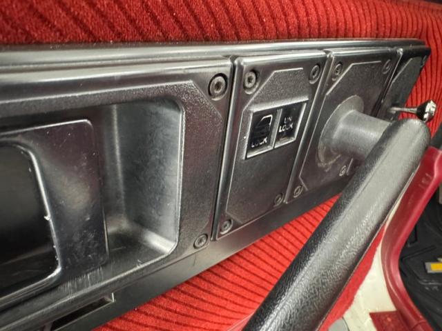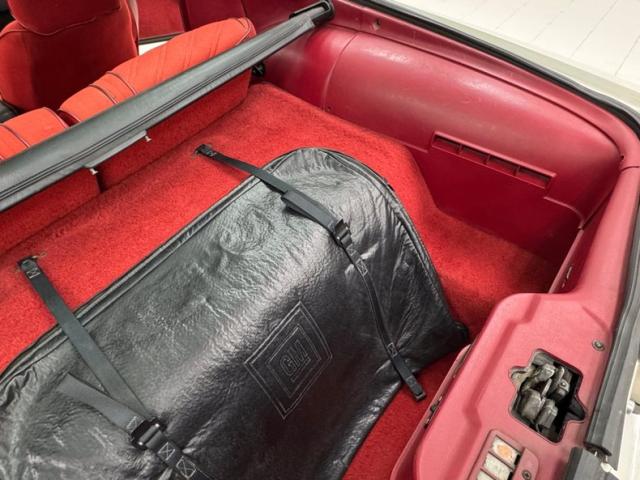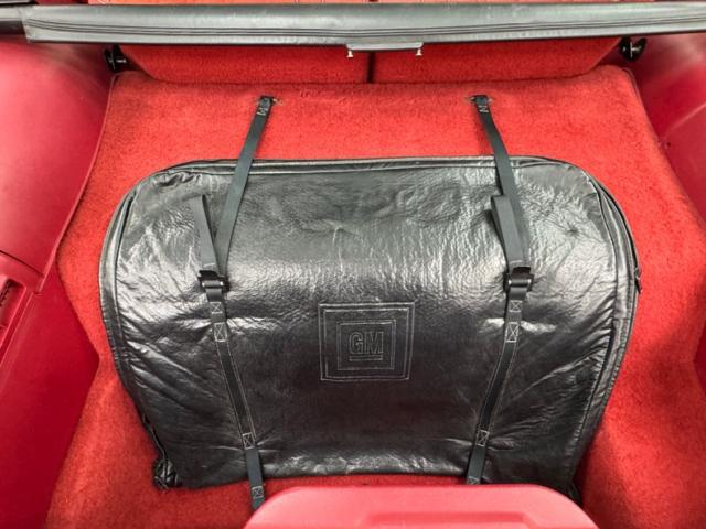 Not unexpectedly, this heartbeat of America is red on the inside, starting with an opening of the doors lined in diagonally designed red velour over carpeted lowers, topped by black switchgear and door handles with some typical fading of the button graphics, otherwise presenting cleanly. Diagonal accenting continues on the cloth bucket seats, red with dark red piping and other than some wear on the side piping, appearing to be in great shape including the passenger seat and rear 2+2. A GT steering wheel replaces the original and fronts a black plastic instrument cluster housing the standard package. A crack in the dash pad and some general minor aging is noted as we look forward and that stays true on the center console where the shifter resides in a plastic faceplate behind an updated AM/FM/CD radio and basic climate panel. Bright red, plush carpet floods the floor and the rear cargo area nicely and the T-top bags are in place and clean.