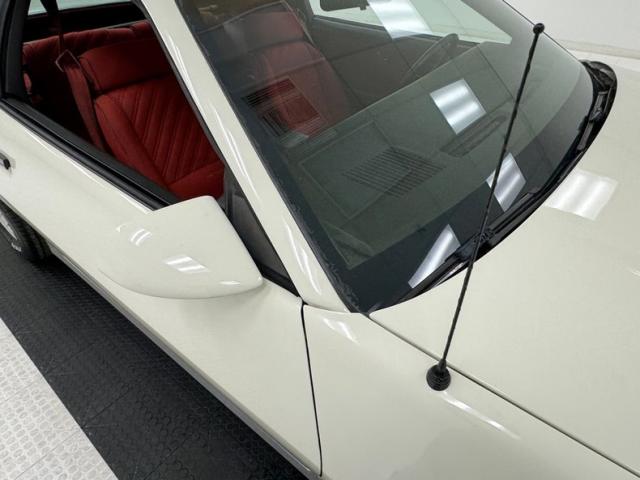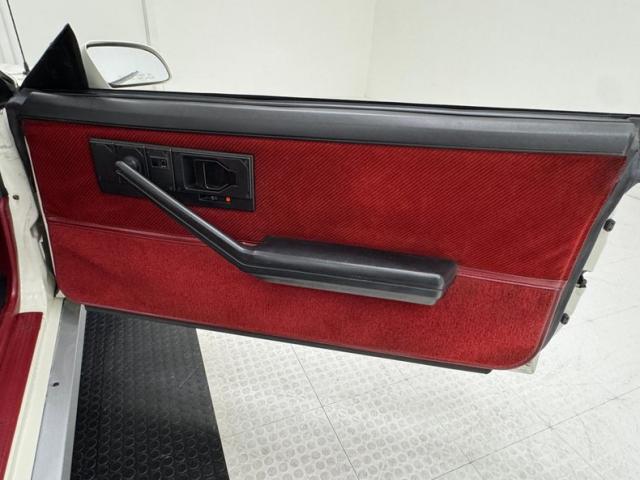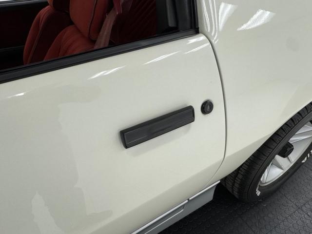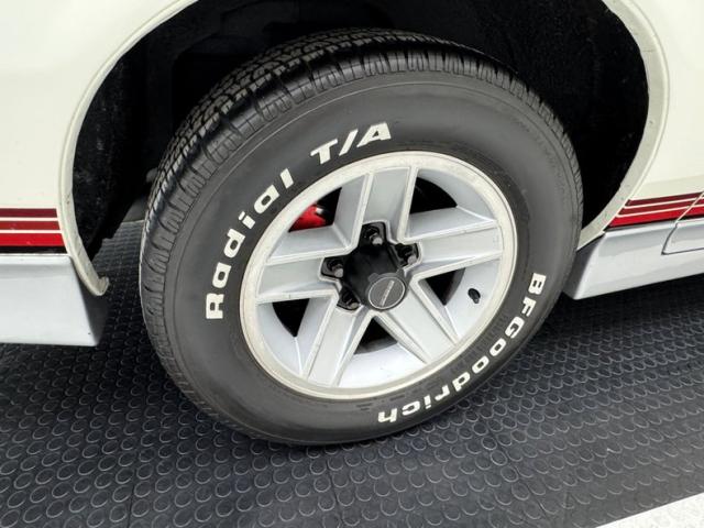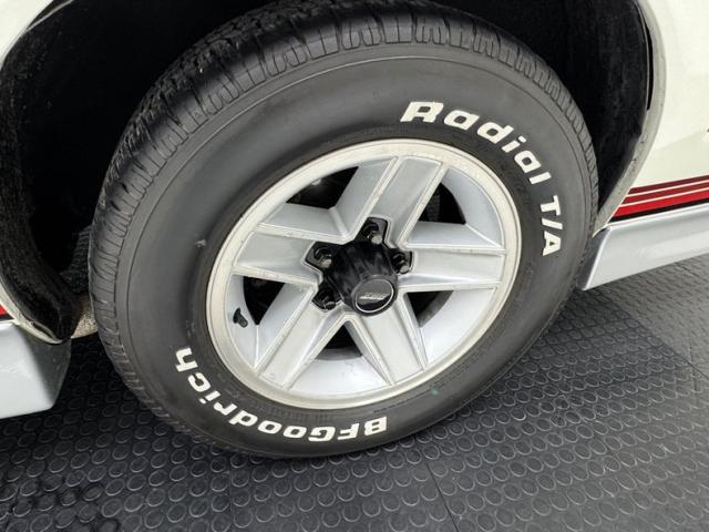 In pure 80\'s style, this Z is designed with two stage Summit White paint with accents that include silver cladding and expanded strobe type striping comprising four stripes of three colors, mirrored too in the Z28 emblems on the rocker cladding and rear fascia. Chevrolet\'s tuned port injection is also advertised in these areas giving the car some additional red light street cred. Distinct hood vents also let challengers know this is no ordinary Camaro and black trimmed tail lights and headlight bezels are also characteristic. 15-inch five spoke wheels are just aggressive enough showing tires with letters out because that\'s how we rolled in 1986! Overall, the body and paint are in great shape with imperfection noted as some delamination in the black windshield border and flex cracks, scuffs, and chips in the front cladding.