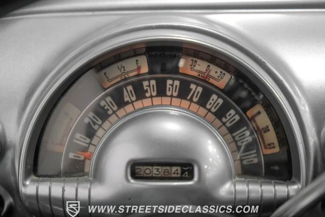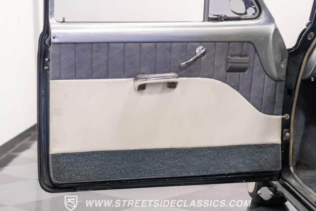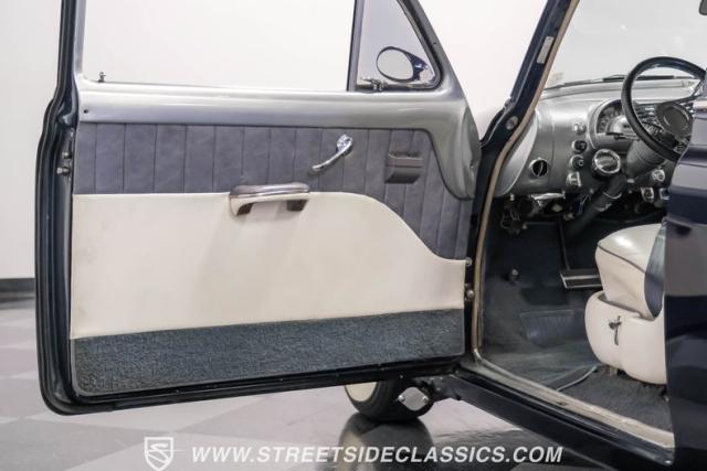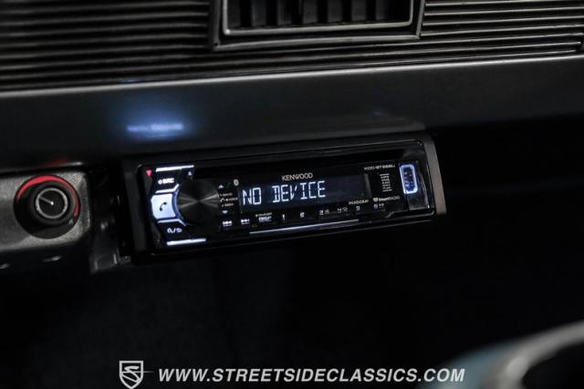 The interior features a two-tone white and gray vinyl setup that combines classic aesthetics with modern comforts. A roomy bench seat provides ample space, enhanced by power windows, power steering, and an adjustable steering column. The custom steering wheel and added armrest offer personalized touches without compromising the original design. A Kenwood AM/FM/CD player with aux input supplies the audio. The under-column tachometer indicates the car\'s improved performance capabilities.