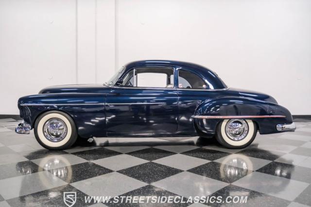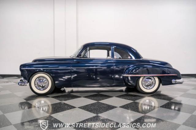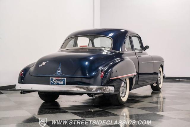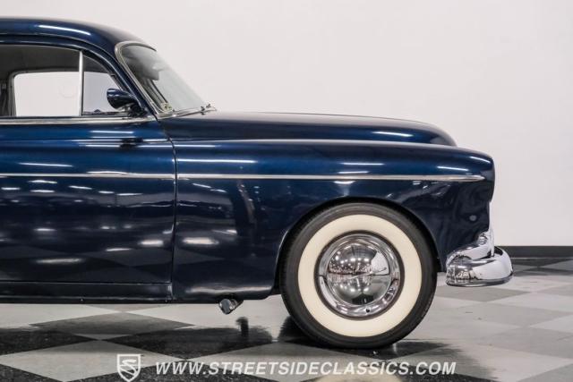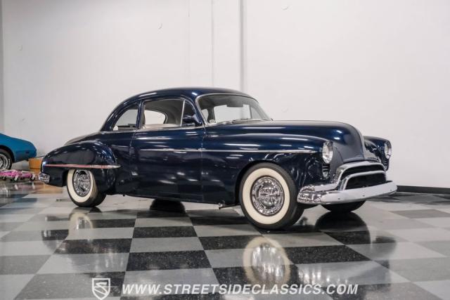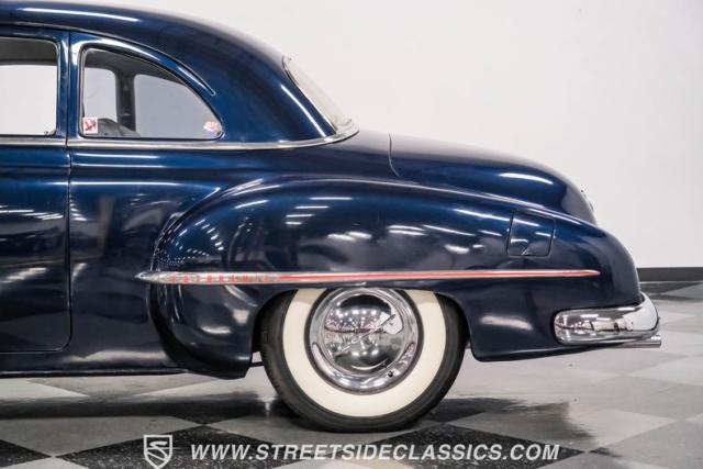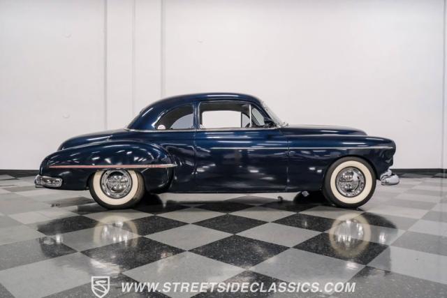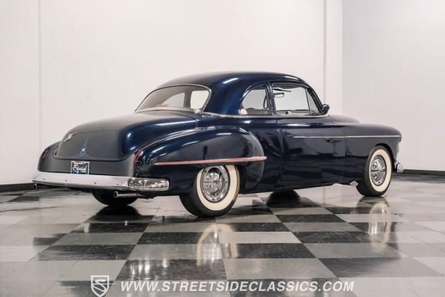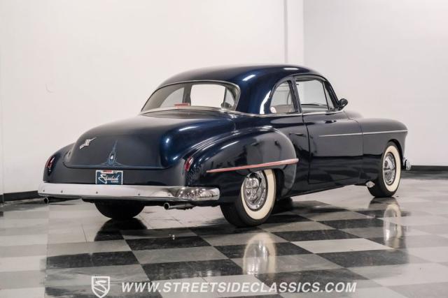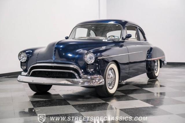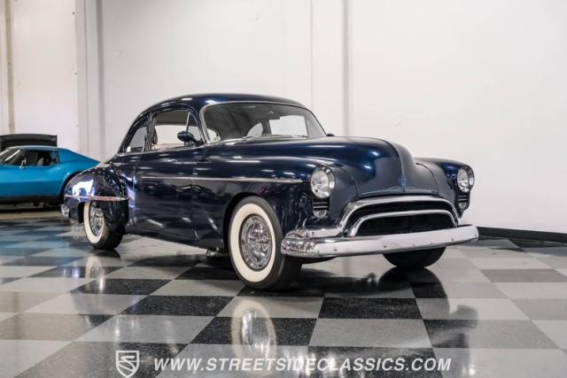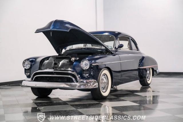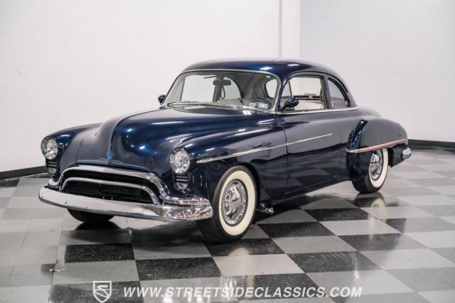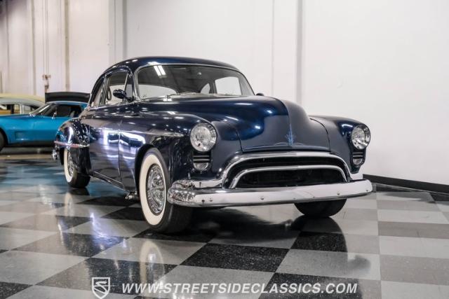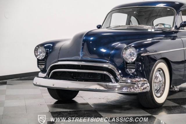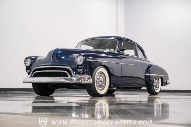 This 1950 Oldsmobile 88 Club Coupe Tribute showcases classic American design with enhanced capabilities. Its dark blue finish emphasizes the flowing body lines, while custom elements like frenched headlight bezels and tri-bar headlights add distinctive character. The Olds sits on 15-inch wheels with 235/75R15 Coker Classic whitewall tires, blending vintage style with improved road handling. Shaved door handles and tailored tail lights with removed trim create a clean, streamlined look that differentiates it from factory models.