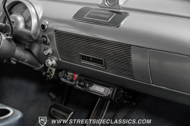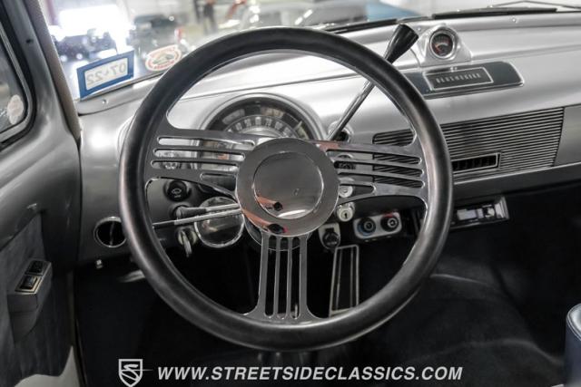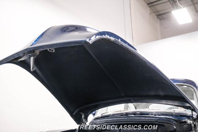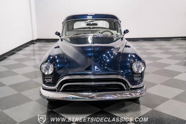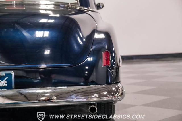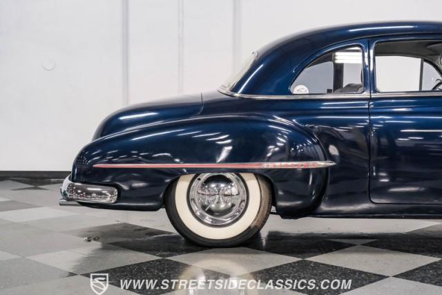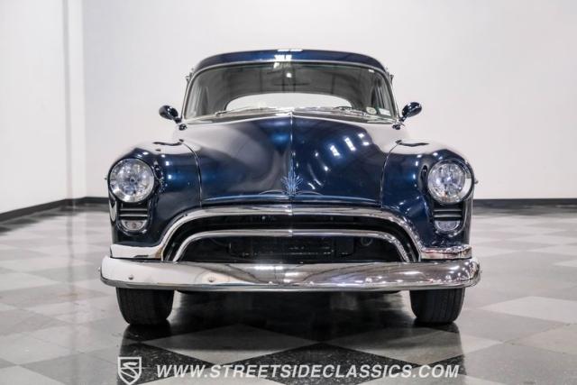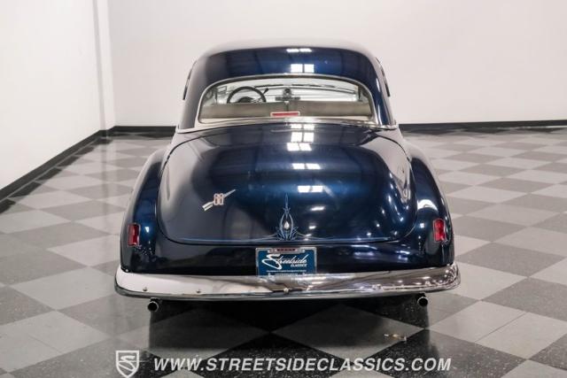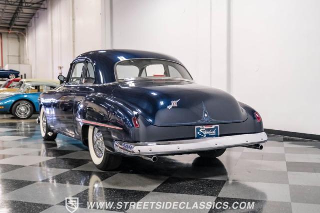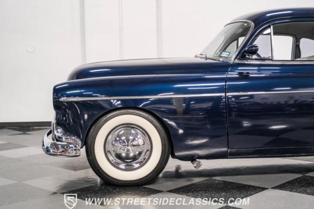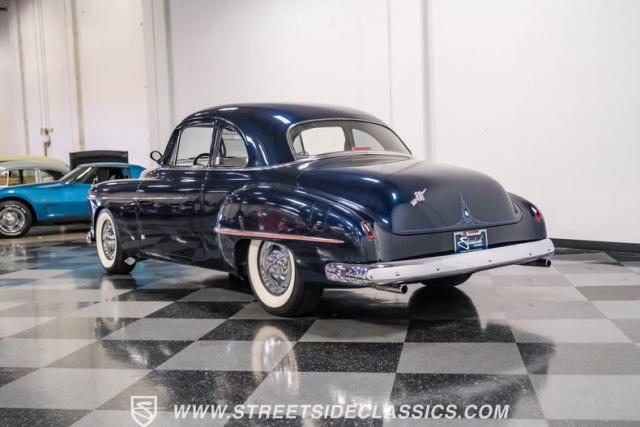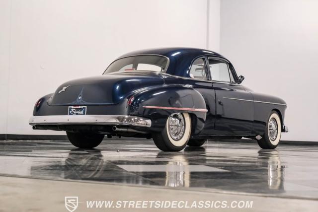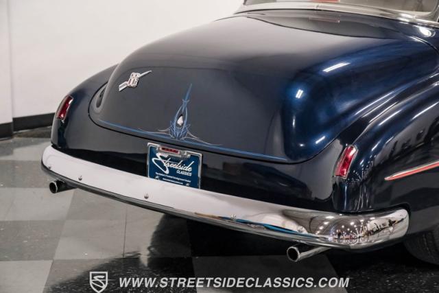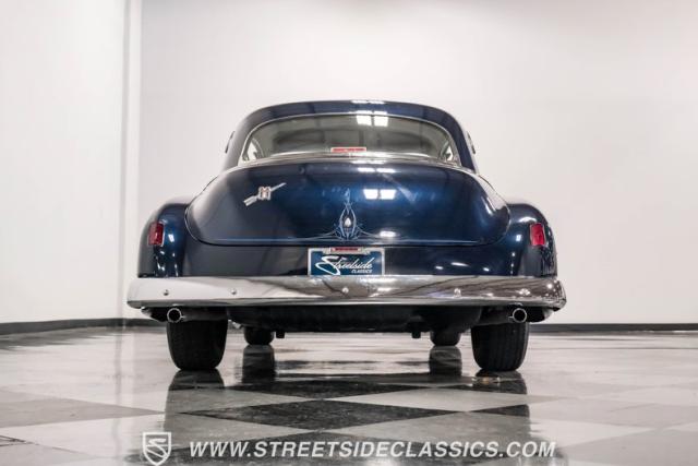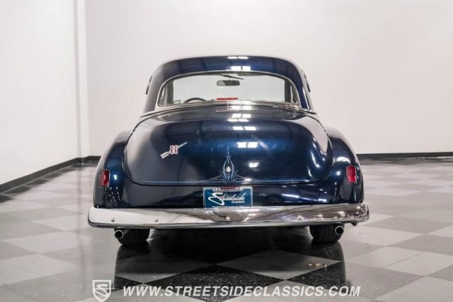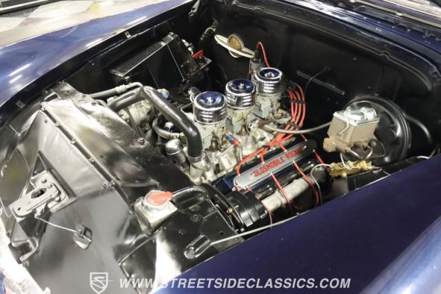 This 1950 Oldsmobile 88 Club Coupe Tribute showcases classic American design with enhanced capabilities. Its dark blue finish emphasizes the flowing body lines, while custom elements like frenched headlight bezels and tri-bar headlights add distinctive character. The Olds sits on 15-inch wheels with 235/75R15 Coker Classic whitewall tires, blending vintage style with improved road handling. Shaved door handles and tailored tail lights with removed trim create a clean, streamlined look that differentiates it from factory models.
