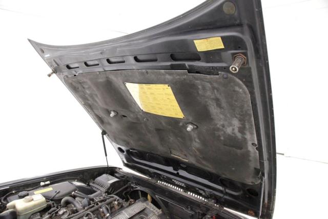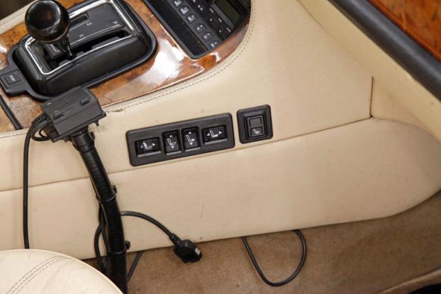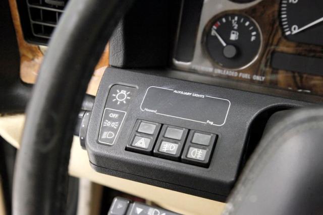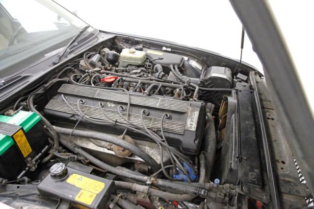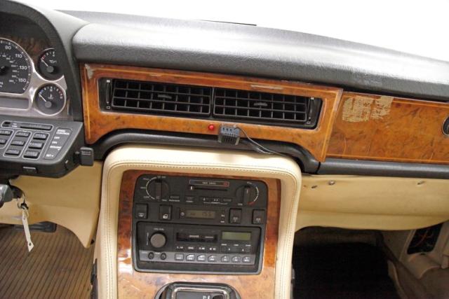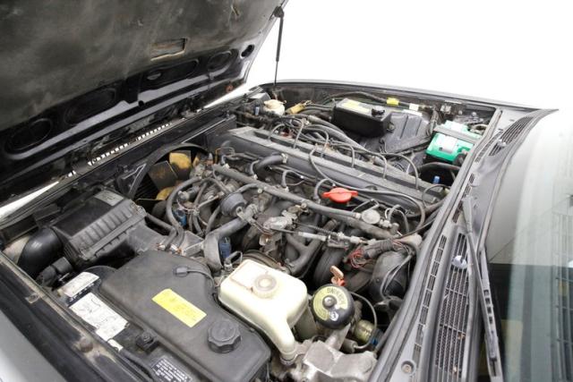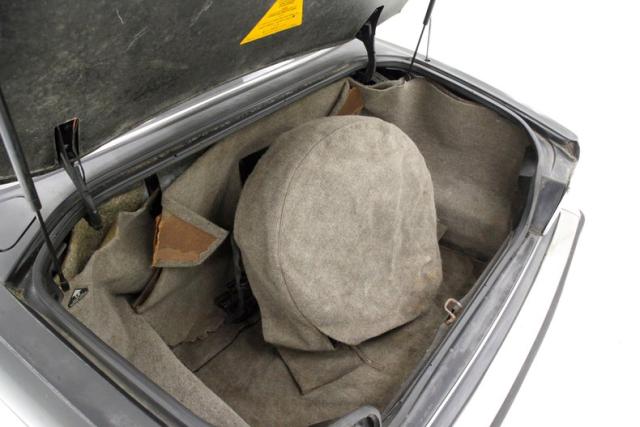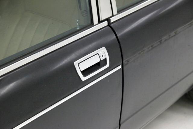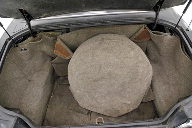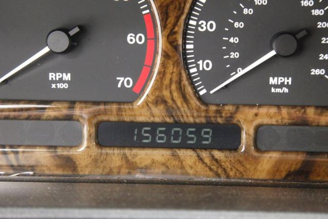 Barley leather dances with burl veneer, black vinyl and some electronics along with analog gauges and digital readouts. A center panel melts into the center console which houses the AM/FM/Cassette player, seat controls, and shift lever. Looking up, a sagging headliner sports a sunroof in the middle. As we turn our eyes to the rear bench which is wonderfully spacious and has access to the back fold out tray that hides within the back of the buckets up front, and their own centrally located temperature controller. All of the leather seating shows cracking and age wear, with the driver\'s seat having taken the brunt of the wear. Nice light brown carpet covers the floors, and black carpeted floor mats are protecting this at every corner.