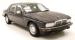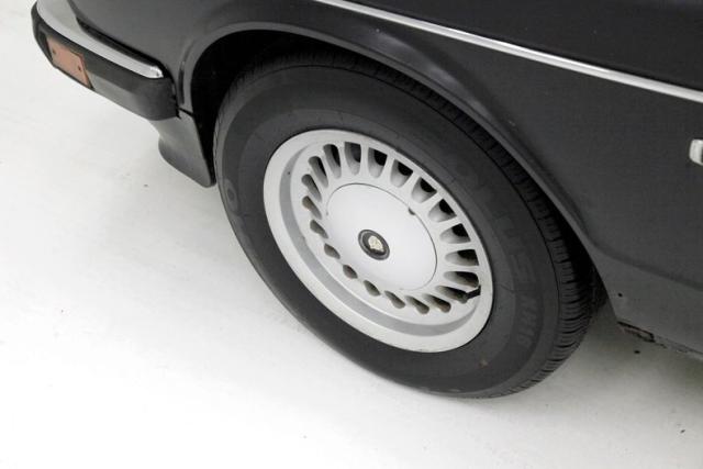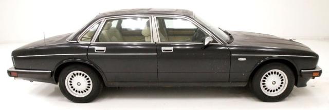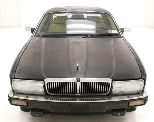 This year makes the change to a single flush mount Euro spec headlight, but retains the separate chromed grille, and non-integrated bumper version for the exterior. A seemingly solidly built car, in 4 doors, and black with the body showing dents, dings, and some rust, some surface and some invasive. The finish has succumbed to the ages and shows with a heavy fading of the shine and clear coat degradation. Otherwise, the chrome and trim is nicely preserved and is utilized sparingly and tastefully on this car. Standard Jaguar wheels are on all 4 corners and tires are good. Noted is missing side trim from each side spear along with cracking and hazing of both the head and tail light lenses.