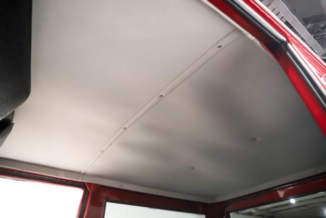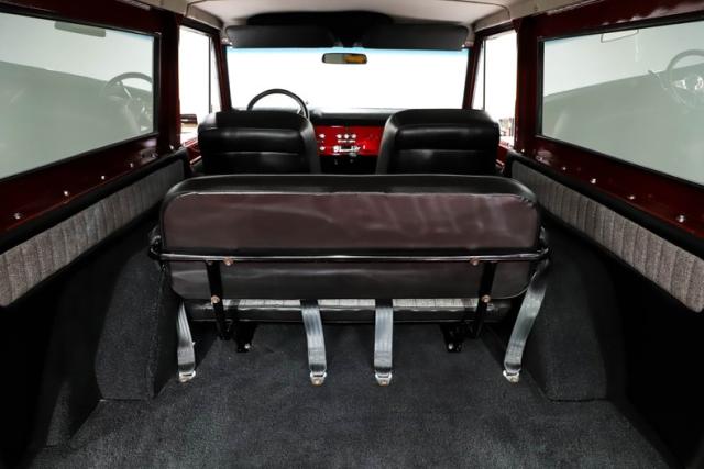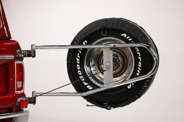 EXTERIOR: This Ruby Red metallic Bronco is a real jewel! The body is pristine, uncut, clean metal. It is straight as a rifle barrel and fits right. The paint is show quality and polished like glass. All of the chrome and trim was replaced. It has optional bumper guards and side moldings. It has all new smoked glass and weatherstrips. It stands tall on 15 inch aluminum Ultra wheels wearing beefy BFG all terrain tires. There\'s even a 5th tire for a spare on the chrome swing away tire holder.