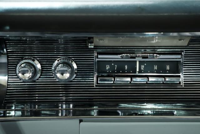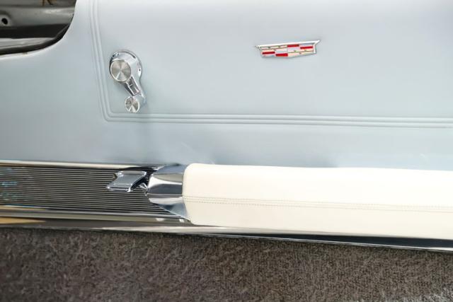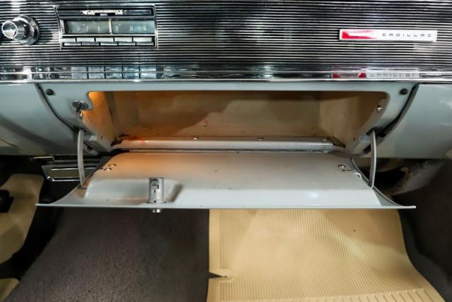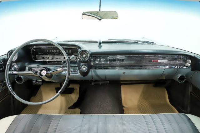 INTERIOR: It looks just as impressive inside. The dash pad is one of the best you\'ll find-an important detail on a 1960 Cadillac, as most are cracked and costly to restore, often requiring months of waiting and thousands of dollars to redo. All of the interior chrome sparkles, the components fit together beautifully, and the presentation is clean and well cared for. Down on the floor is gray carpeting with white Cadillac floor mats for a classic, upscale contrast. The seats offer excellent cushioning and have been reupholstered in gray cloth with soft white leather trim. The door panels are in mint condition, and the headliner is excellent as well. There is only some mild staining on the driver\'s seat upholstery; otherwise, the interior shows extremely well. It\'s also highly functional. The signal-seeking radio works, along with the interior lights, power windows, and power seat.
