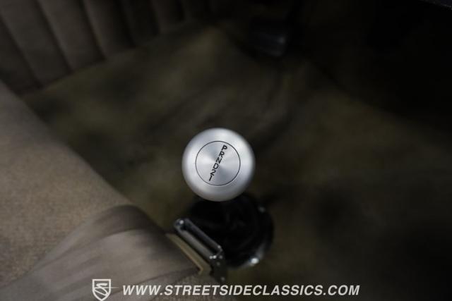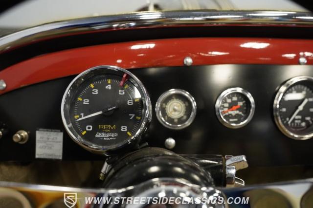 Inside, the tan cloth interior is plush and contrasts with the no-nonsense attitude of the four-pod dashboard and offset column-mounted tachometer. A thick three-spoke steering wheel, a toggle switch, and a starter are the only distractions either the driver or passenger will have to contend with, other than the exhilarating sound of those side pipes bellowing just beneath. The bench seat feels snug around you, allowing room for your legs to slide under the non-tilting steering wheel with ease. Seatbelts and a chrome filler cap just aft of the cockpit button round out the amenities you\'ll find inside this T-Bucket.