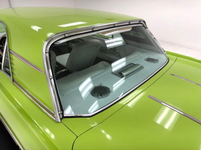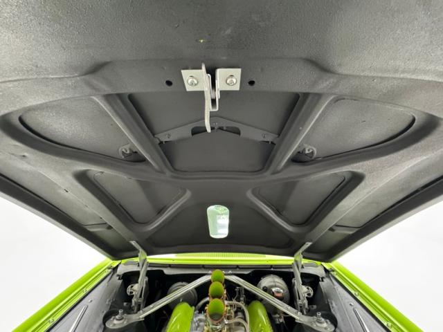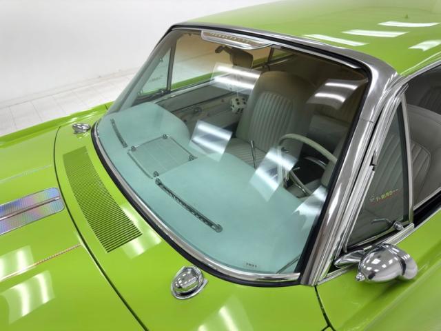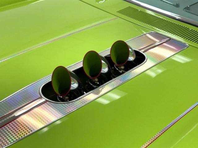 Can\'t miss Lime Green paint brightens this bird and is augmented by wildly reflective side trim on the custom side spears, hood stripes, and c-pillar trim, all bordered in red. A custom sculpted plate fronts the hood scoop and three velocity stacks face forward from an oval opening. Custom mirrors, bullet fronted door handles and window trim, recessed torpedo tail lights, all part of this feast for the eyes! The grille also features bullet details between dressed headlights and the 15-inch polished American Racing Torque Thrust wheels are complex works of art with bullet hubs, reflective inserts, and red line trim on white wall tires. The rears, however, are shrouded by the lime green fender skirt. Finally, faux side pipes add a stretch of chrome to the bottom. The paint, trim, and custom features are in great shape and we could not find any exterior imperfections.