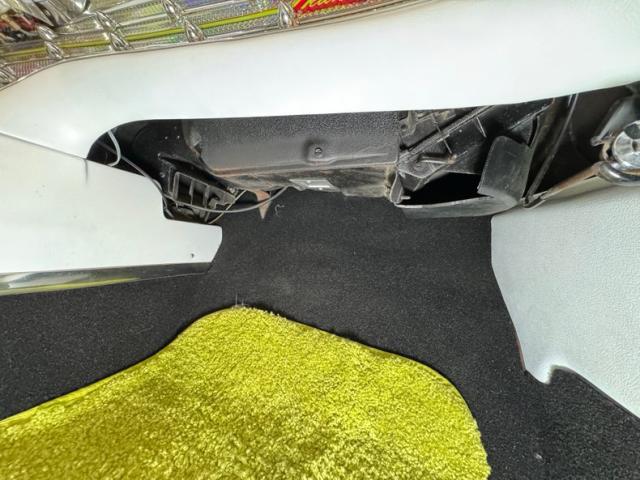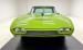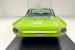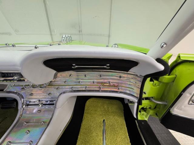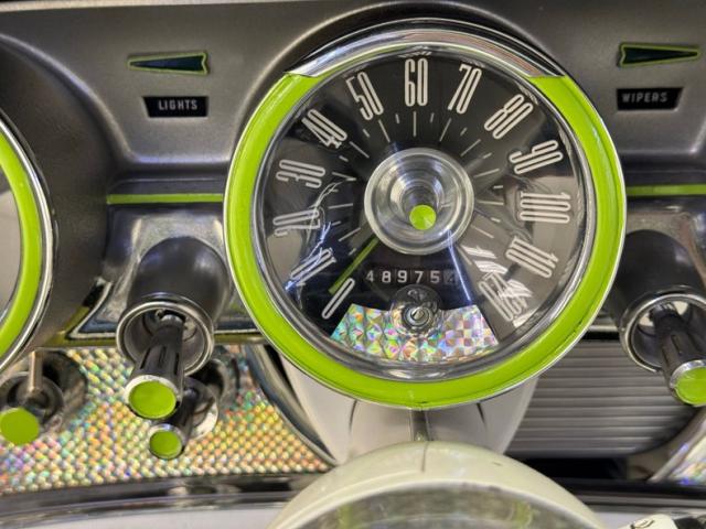 More of that turned metal reflective trim occupies an insert in each door, surrounded by white vinyl panels and a black carpeted lower. White vinyl also covers the bucket seats and rear 2+2. It\'s bullets galore on the inside where there might be more full metal jacket trim pieces in here than in your gun safe, and these little chrome cones create a reflective sparkle in back and in the front where they sprout on the dash and center console. The rainbow reflecting turned metal trim is everywhere as well, including the steering wheel, accented with lime, and the gauge cluster, also featuring lime rings and buttons under a white dash pad. An AM radio and CD player are present along with added gauges in the center, while black carpet is protected by lime shag mats. Faux black fur is on the headliner with tribble-like hairballs in white and lime scattered throughout. Wild! And more attention to detail with lime rails and LED lights overhead. The trunk is kept relatively conservative with clean black carpeted mats and a spare white wall.