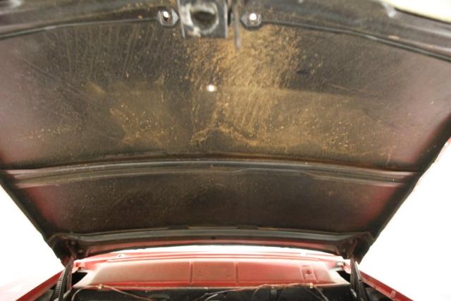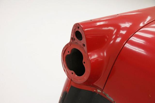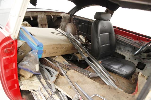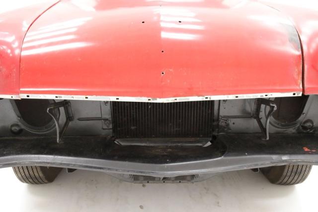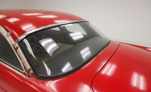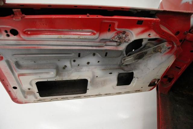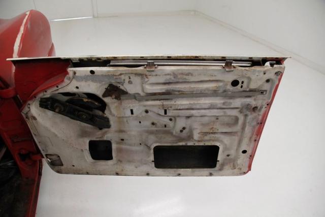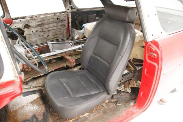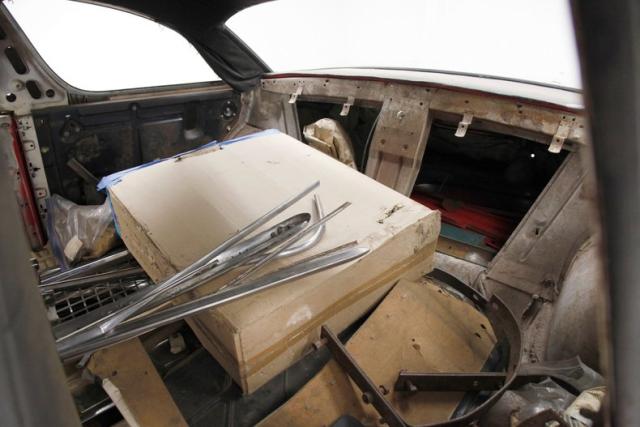 The shell of the interior is devoid of any hint of the factory seating and a single black leather bucket seat has been set in front of the steering wheel. Our consignor states that the original seating is available with this vehicle should you want to take this back to showroom original. The original dash is present in red and white and houses most all of the original gauges, knobs and buttons. The flooring is covered with exterior trim parts as well as some boxes of various parts allowing only small glimpses at the surface rusted steel flooring.
