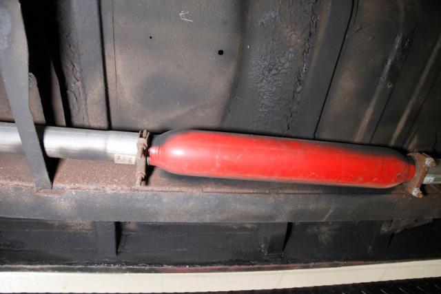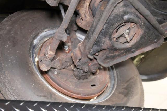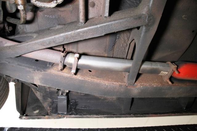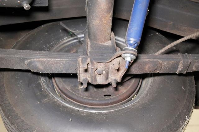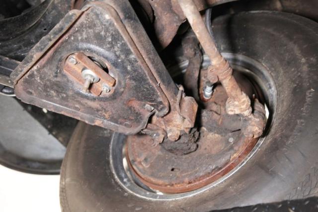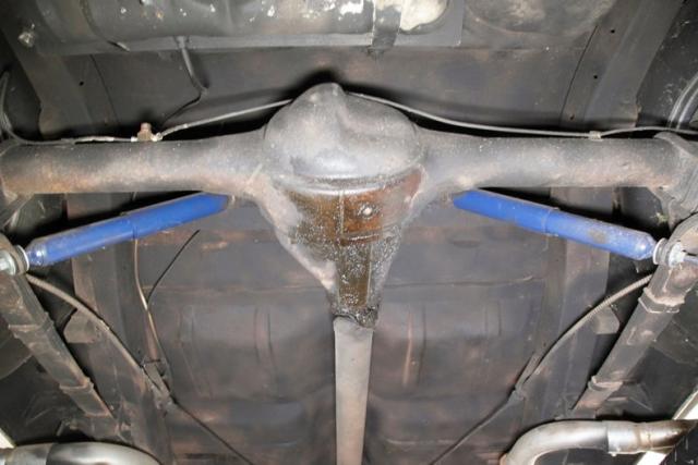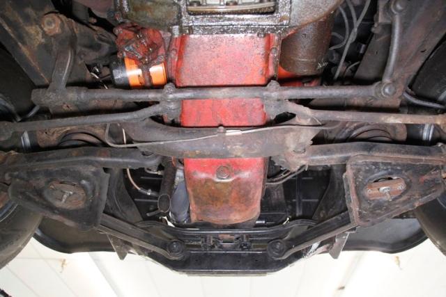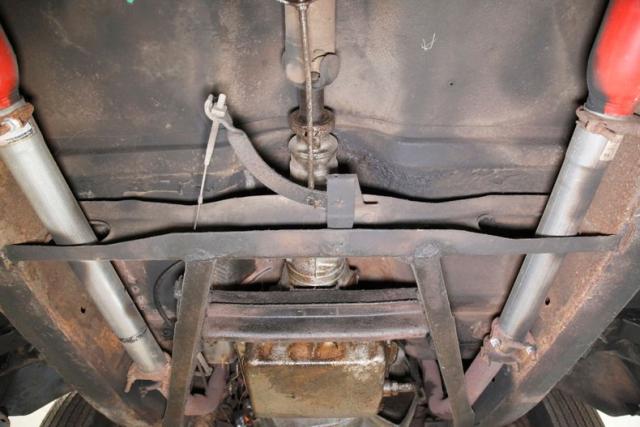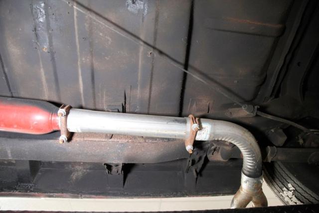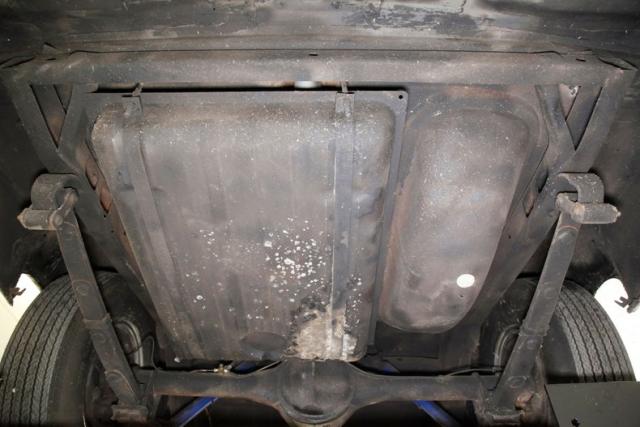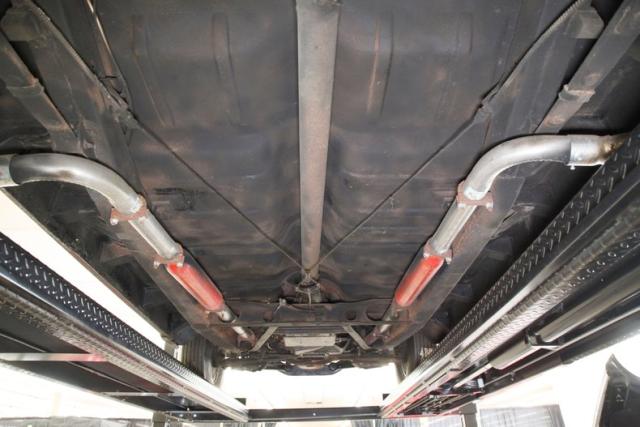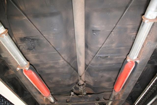 Some surface rust is coating various parts, and it is lightly coating the underside of the frame. The exhaust appears fairly new, and it is a dual glass pack setup. Power drum brakes are all around. Noted as well surface rust is on the rockers, a few body hangers have been replaced in the past and new brake lines have been installed.