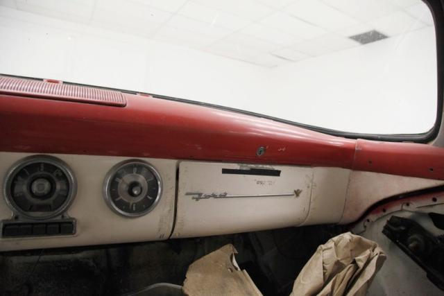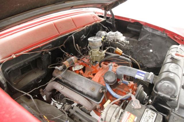 A look into the engine bay and at one point there has been some work done on the engine block and intake manifold as they are a nice Ford red. Otherwise, some surface rust and paint chipping are noted throughout along with a coating of dust and patina. Newer hoses are on, and the original radiator is still there. As for the specs, it has its original 272 ci V8, which is fed by a single 2-barrel carb atop, and a Ford-O-Matic automatic transmission on back, with a 3.31 rear axle.