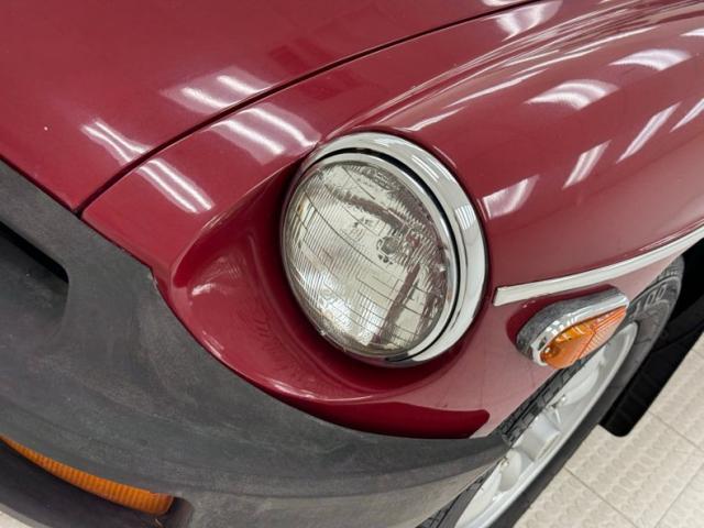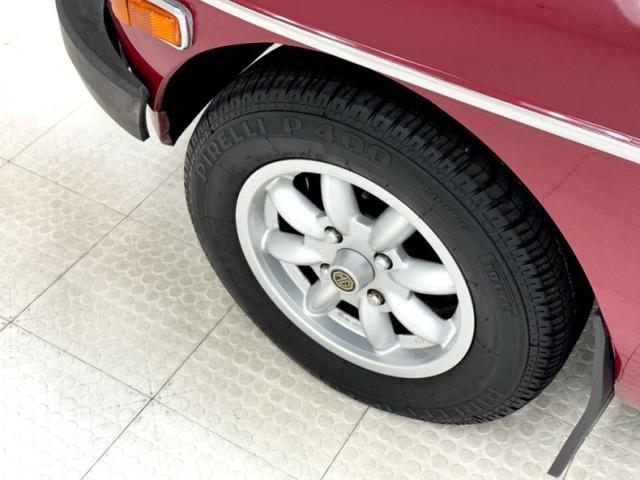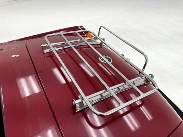 Damask Red is a shade of burgundy paint that coats our car, fronted by a rubber bumper that could use a bit of detailing but is in great shape. The inset headlights wear chrome rings while marker lights are sculpted into the bumper and side markers ride the fender at headlight level. A side trim piece intersects the body of the car for visual interest and maybe to save a ding or two along the way. Around back, the tail is finished by the protruding tail lights with the amber taking up a good part of the light that\'s topped by red. Reverse lights are small cubes located on the rear panel above the rubber bumper. The MG octagon is partly obscured by the luggage rack which provides extra storage on this diminutive little Brit, and from back here we note the rear window of the soft top is crystal clear, as are the side windows. The 14-inch Minator are a great choice here, and a common one for good reason on MG\'s. Most of the metal work is in great shape. Imperfections include scuffs and scratches near wheel openings and a tear in the canvas top.