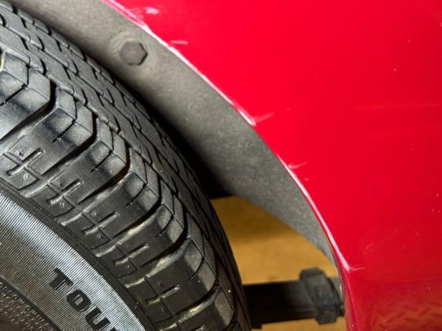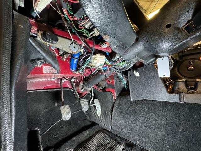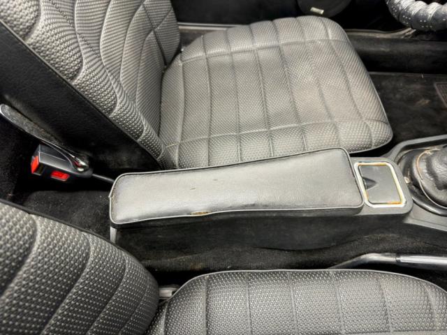 The door panels are constructed of black vinyl in a simple design with basic hardware and an added speaker, with the vinyl showing just a bit of looseness. Tall backed bucket seats feature the weave grain in the vinyl and a simulated tuck and roll design, and each wears a head restraint and are in very good condition. The 3 spoke steering wheel is wrapped with an aftermarket cover and leads to a busy little dash with six gauges, four idiot lights, and numerous toggles and knobs on a textured black face all showing a bit of patina. The plastic molded center stack contains an AM/FM/CD player and vent controls while the glove box is nicely molded into the dash and shares an edge detail on the bottom. The wood topped shifter in the center console is nice and booted in black leather with a loose retention ring, and fronted by a clever cupholder that some smart aftermarket company designed to fit the space. The armrest behind it all shows some wear and the ashtray shows some rust. Low pile black carpet covers the floor, loose in some places, but in overall decent condition. The trunk is mostly barren but contains a spare tire.
