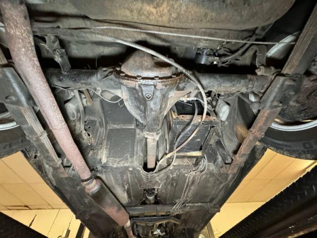 Driver quality conditions prevail underneath as well with surface rust, some of it pitted, grease sling from the front U-joints, and a touch of oil on the flywheel cover. But the knuckles are clear of grease and we\'re not seeing invasive rust anywhere. A factory header ends up in a single exhaust that encounters a stock style muffler before exiting via a straight pipe out back. There is no catalytic converter present. The suspension set up consists of coil springs up front and leaf springs in the back.