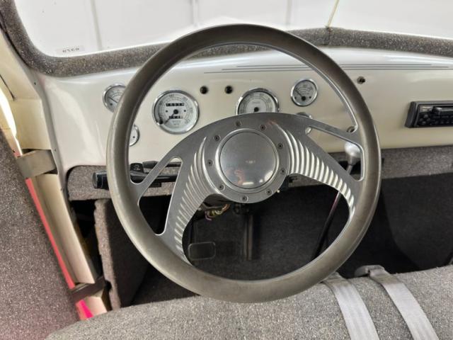 Gray tweed covers the door cards including the window frame, arm rests, and door pulls. Power windows and power locks are present! The back doors, which open suicide style, receive the same treatment. Tweed covers the walls and spills onto the bench seats, front and rear, for a clean monochromatic look. Rear passengers have ample space and a handlebar mounted on the back of the front seats. Soft and spacious, the bench seats are in great shape save for a hole on the front passenger side. A wings style hotrod steering wheel recalls the outside wheels and the metal dash is smooth, painted in body color white. VDO vintage line gauges relay the important information including RPMs, while a panel of tiny lights let you know what gear you are in. An AM/FM/Cassette radio is on the right side of the dash and vent controls are found lower on a tweed panel. A Lokar knob sits atop the floor mounted automatic shifter, and can you guess the material covering the floor? Tweed, it is! Everything matches including the headliner which is in fine shape. Yep, in the trunk as well where we find a spare tire and the battery.