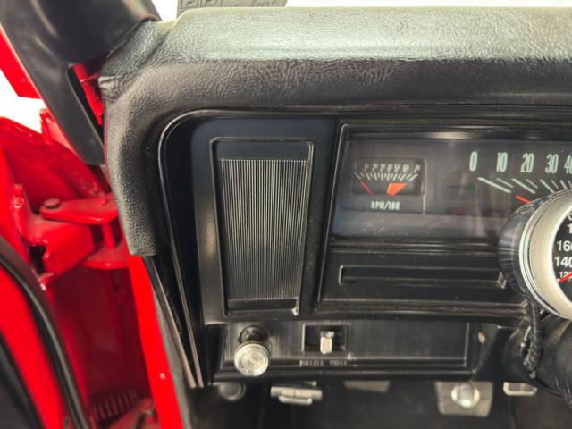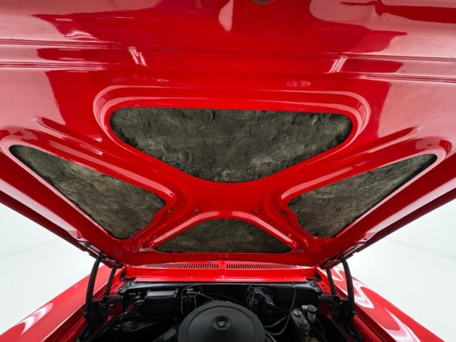 Black vinyl door cards cleanly present with a band of woodgrain trim across the top and stitch patterned inserts and both are clean and intact. Weaved pattern center strips highlight the tall black vinyl front bucket seats, also in great condition and repeated on the back bench. A sport steering wheel now shares the column with the tachometer, water, and oil gauges, all leading to a decidedly horizontal gauge cluster in which the 120 mph speedometer, mostly blocked, all behind a plexiglass cover. An AM/FM radio is in place under vent levers, and four square gauges present in the center console, and an EFI screen now occupies the ashtray compartment. A Hurst shifter rises from the center over black clean black carpet and under a slightly blemished headliner. The trunk presents cleanly and houses a spare and jack.