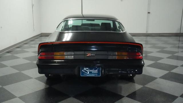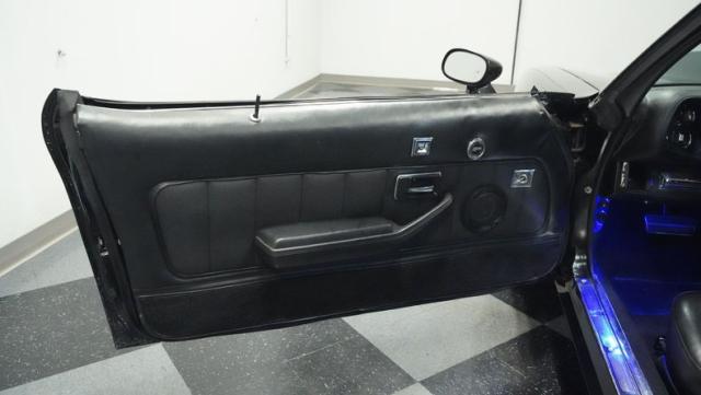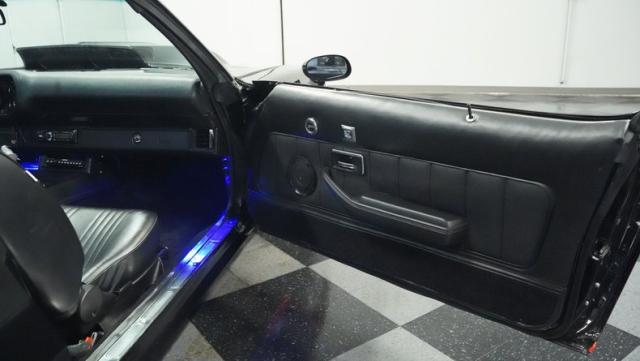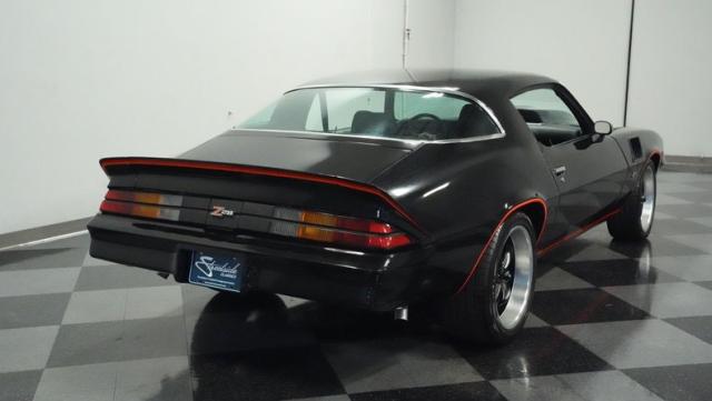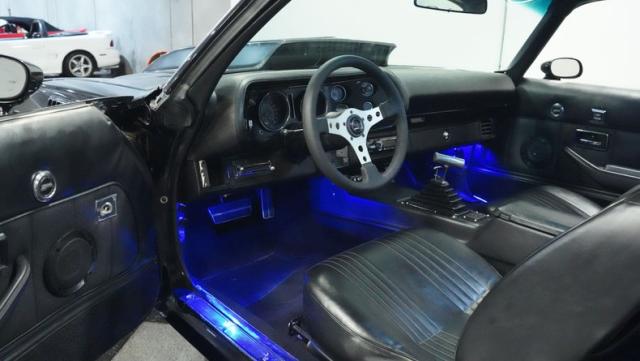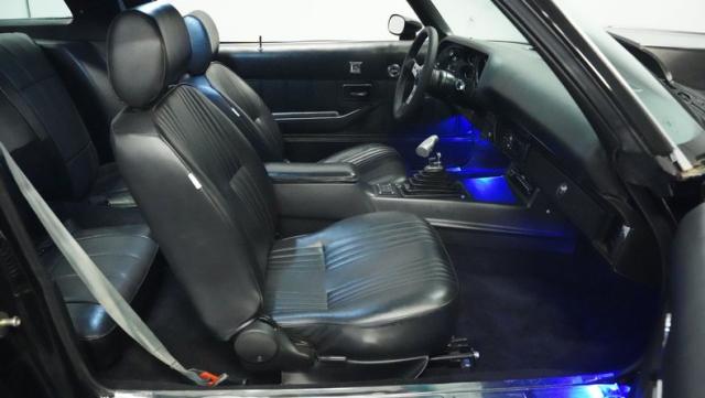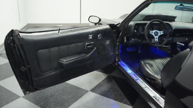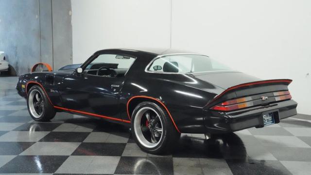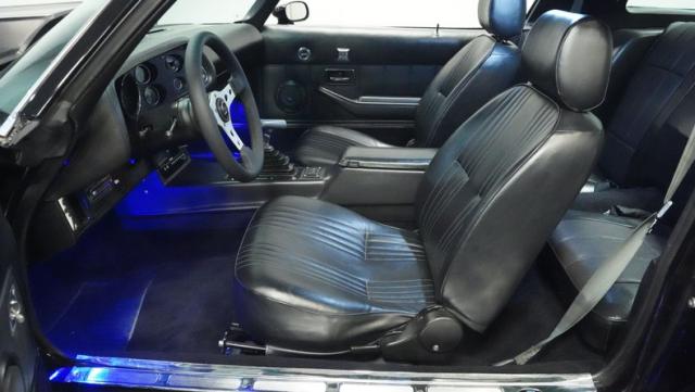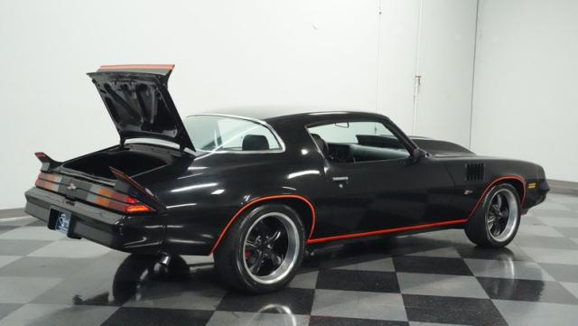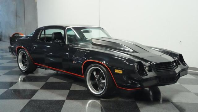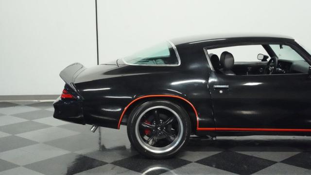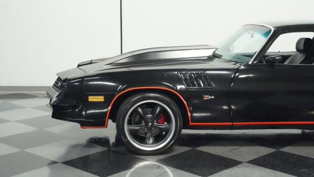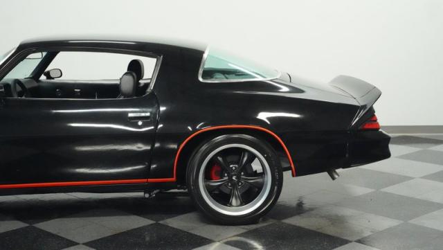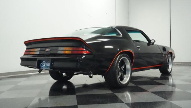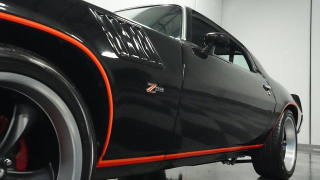 This 1978 Chevrolet Camaro Z/28 Restomod showcases over $10,000 in recent upgrades, making it a true performance machine. The sleek black exterior gets an extra kick from bold orange Z/28 stripes. A cowl hood adds muscle car attitude, while the body sits perfectly over 18-inch wheels wrapped in 245/40ZR18 front and 275/45ZR18 rear performance tires. LED headlights illuminate the road ahead, while the lowered stance comes courtesy of 2-inch drop leaf springs.