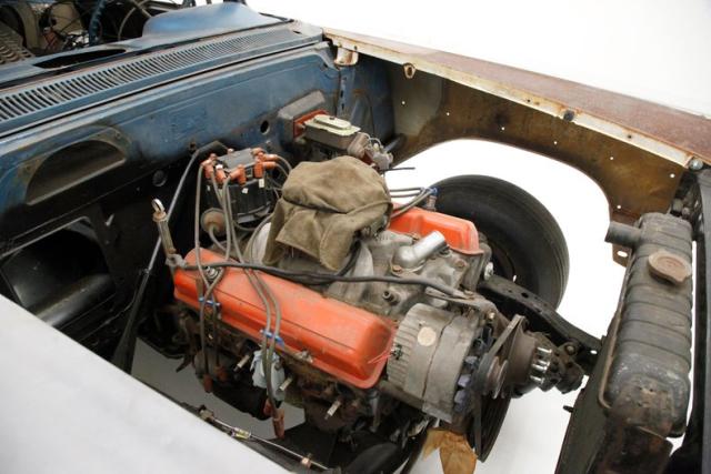 This car has a 350ci V8, not original to it, and it also is in a state of needed rebuild. The carburetor is on, and the engine is mostly complete, however we did not try to crank it. Side panels for the engine bay are currently missing, but may be in the car.
